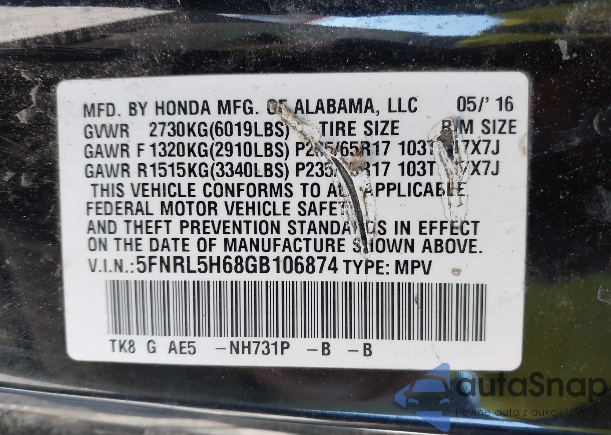 • VIN 5FNRL5H68GB106874