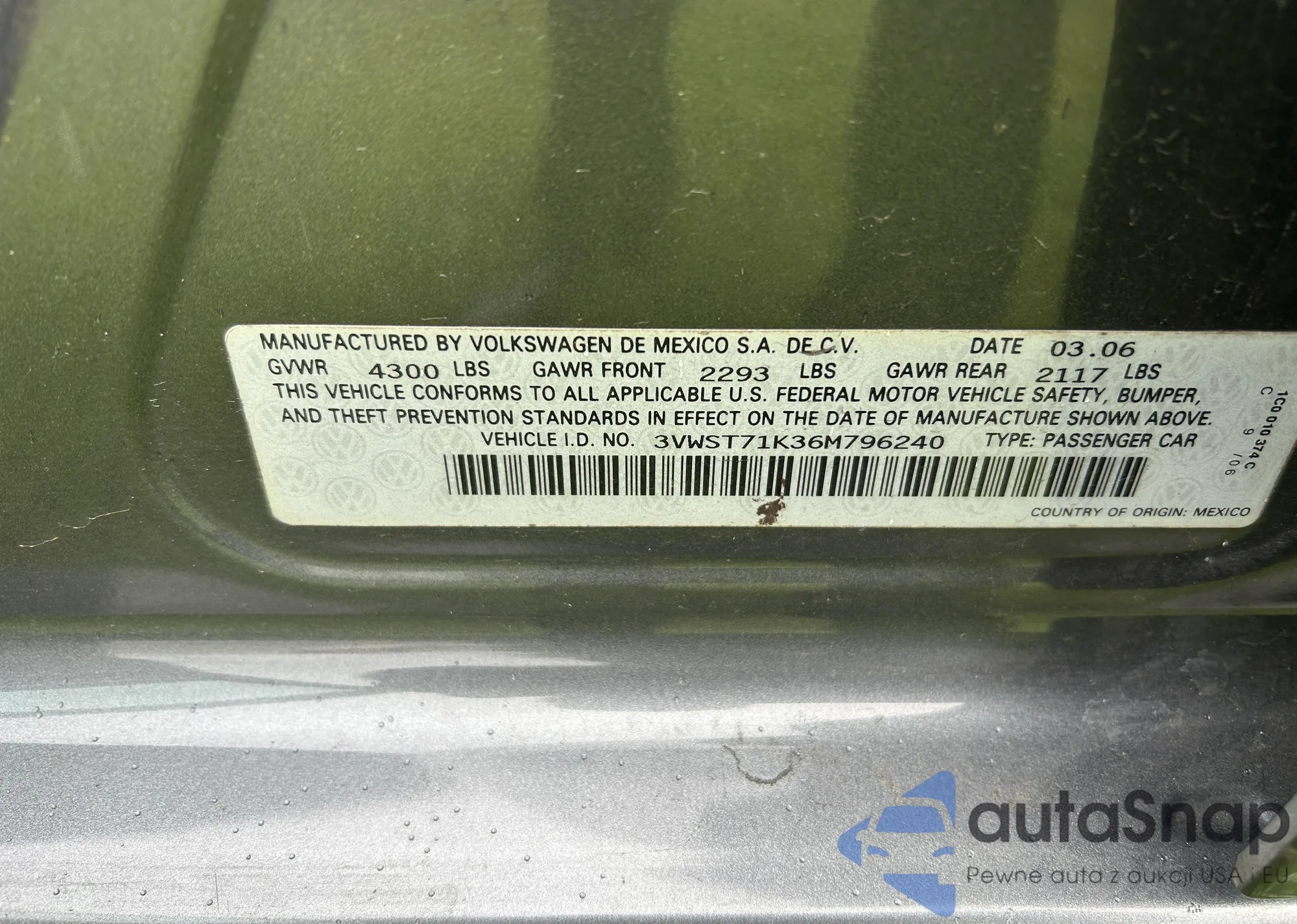 LOT: 42957375 VIN: 3VWST71K36M796240