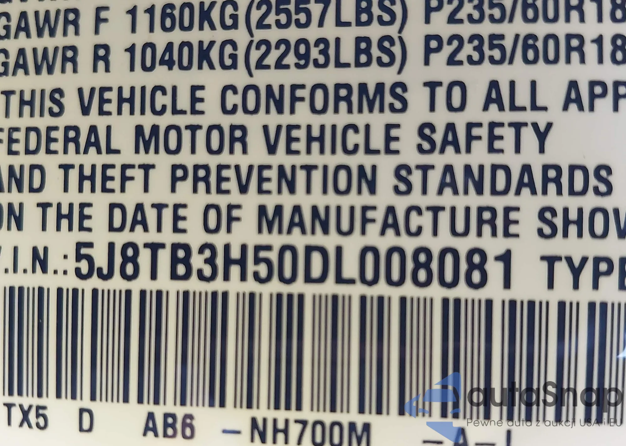 • VIN 5J8TB3H50DL008081