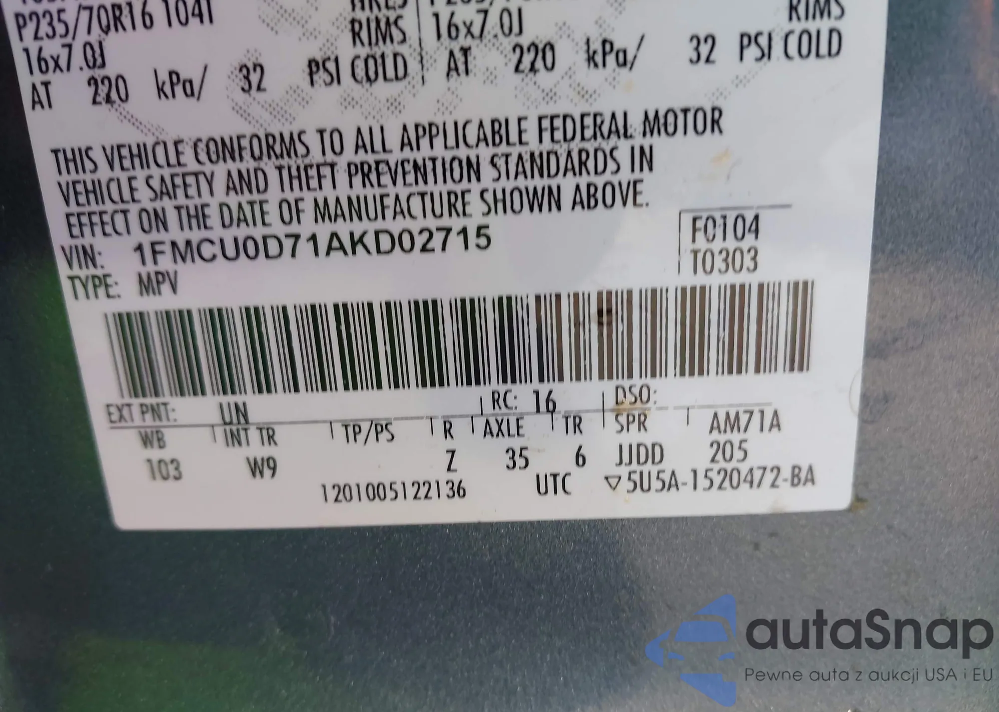 • VIN 1FMCU0D71AKD02715