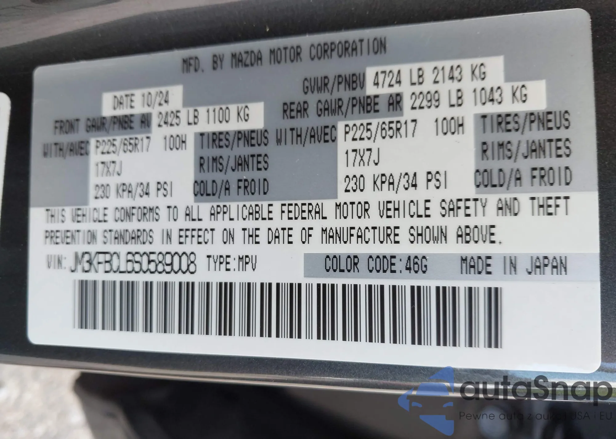 LOT: 43186821 VIN: JM3KFBCL6S0589008