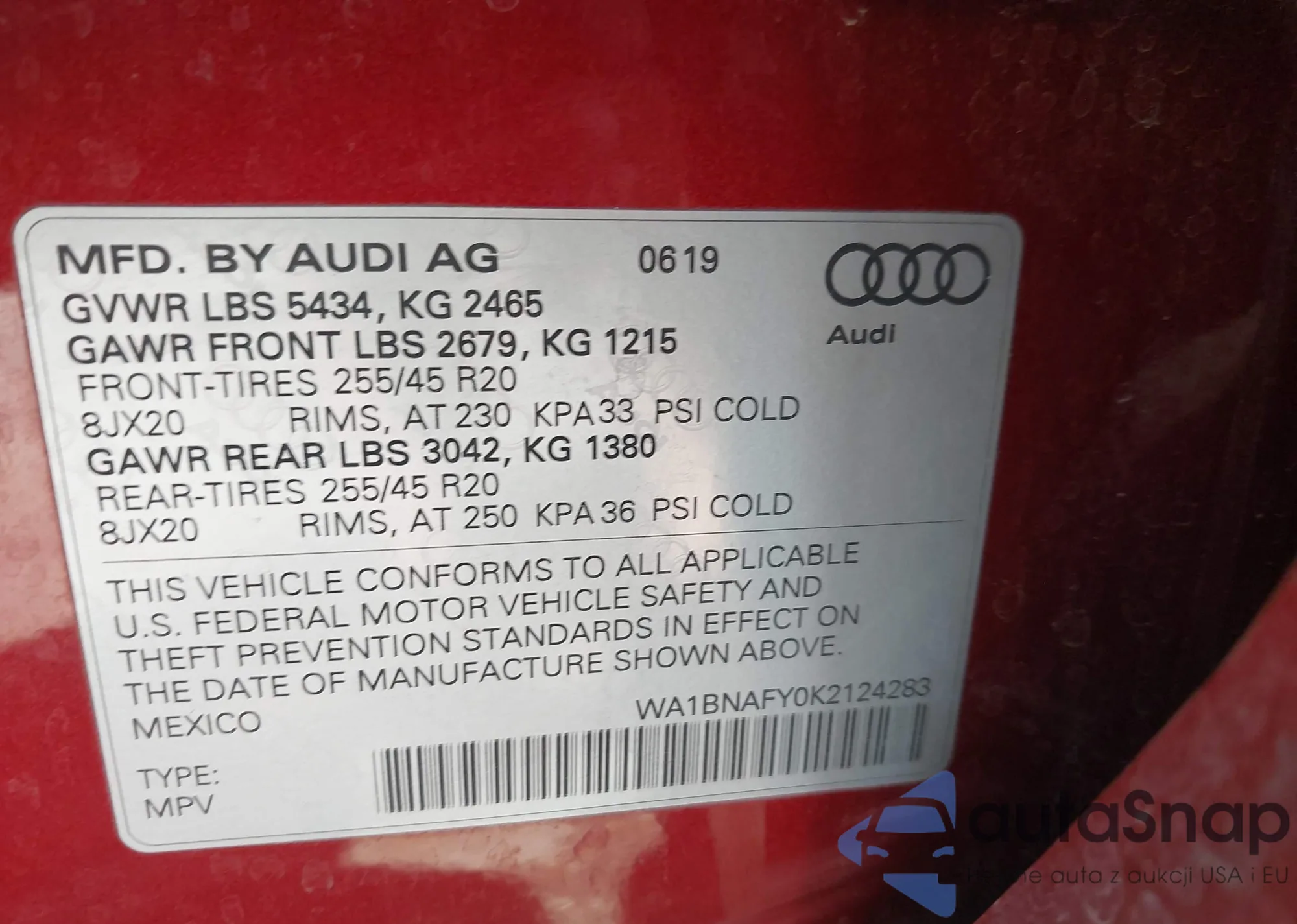 LOT: 43215100 VIN: WA1BNAFY0K2124283