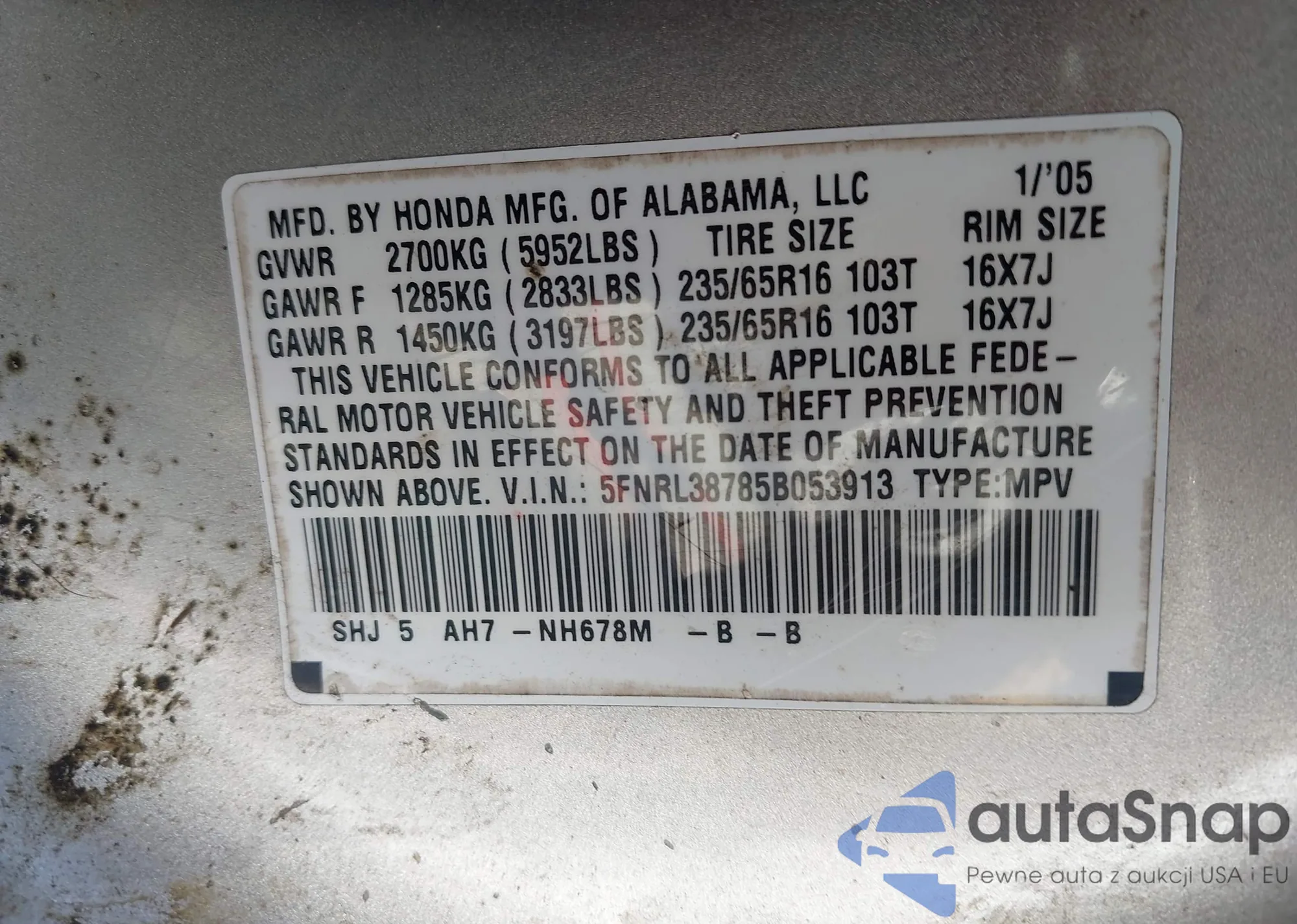 • VIN 5FNRL38785B053913
