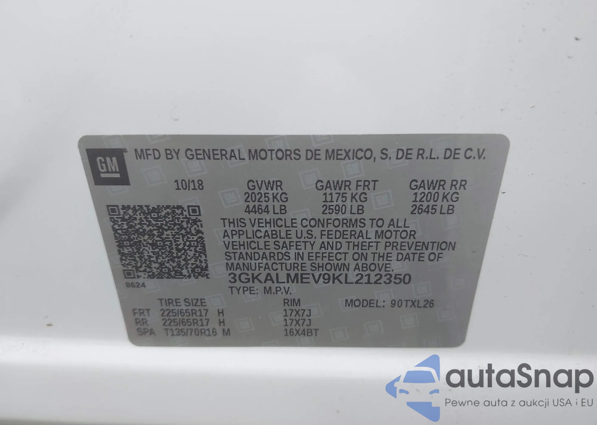 LOT: 43179140 VIN: 3GKALMEV9KL212350
