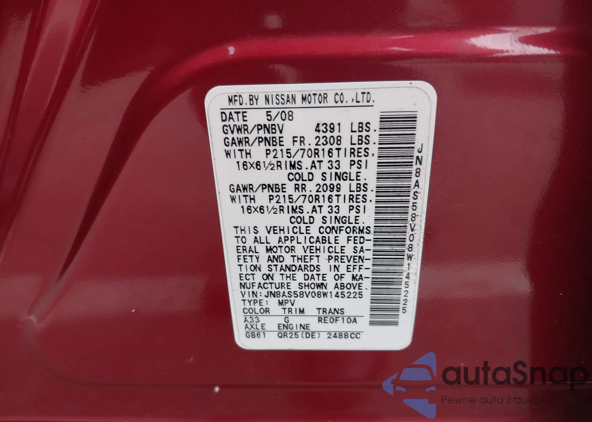 LOT: 43162704 VIN: JN8AF5MR3BT010925