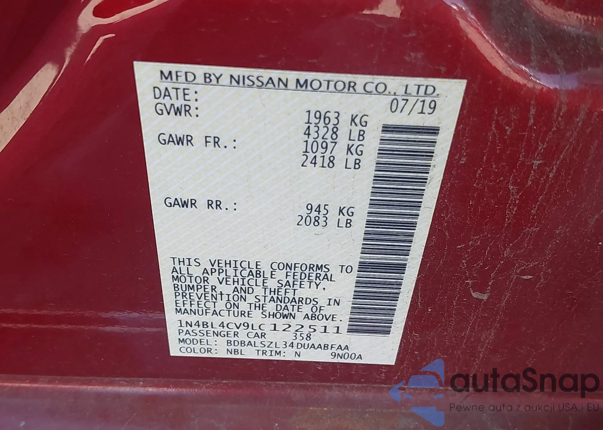 • VIN 1N4BL4CV9LC122511