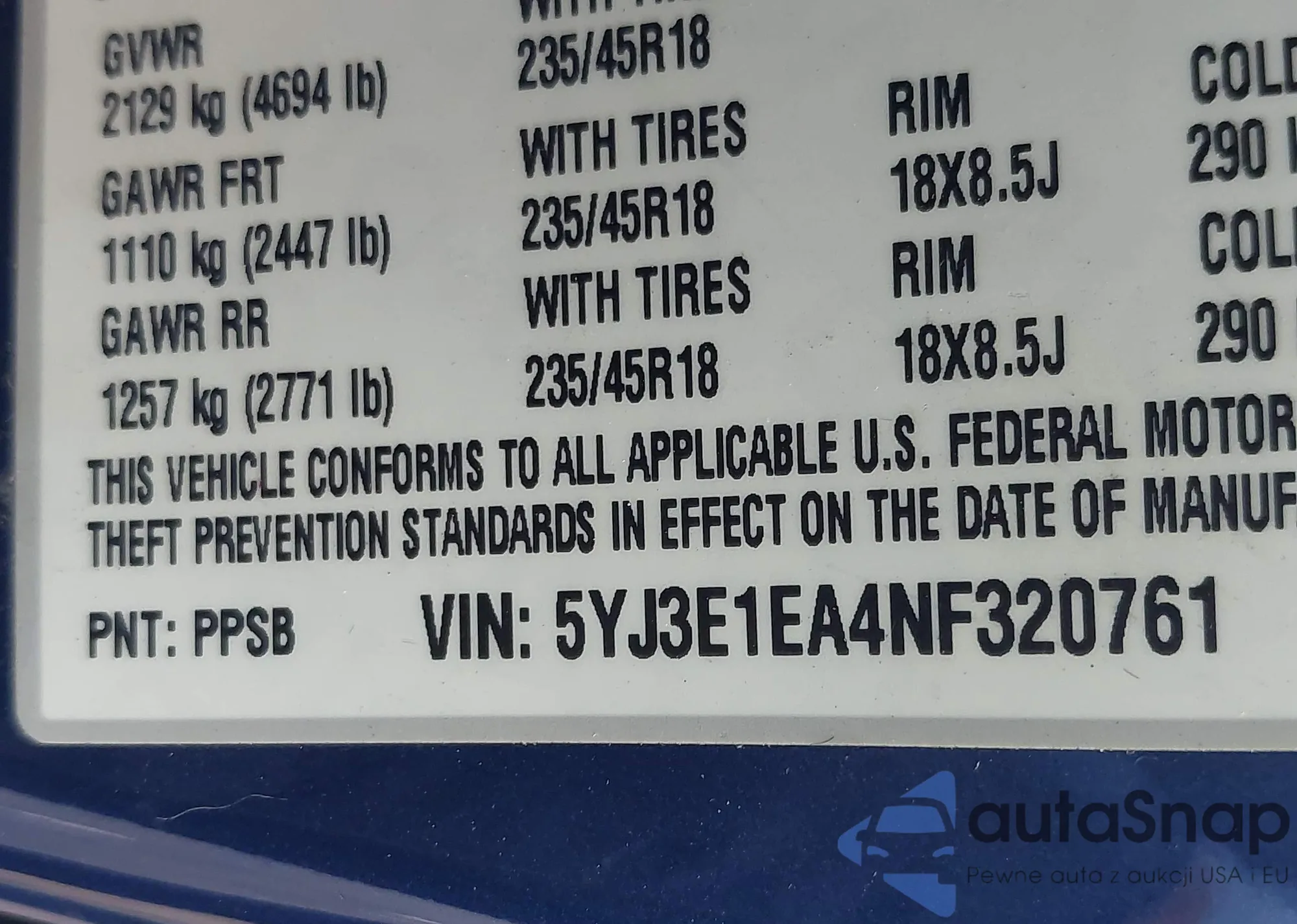 • VIN 5YJ3E1EA4NF320761