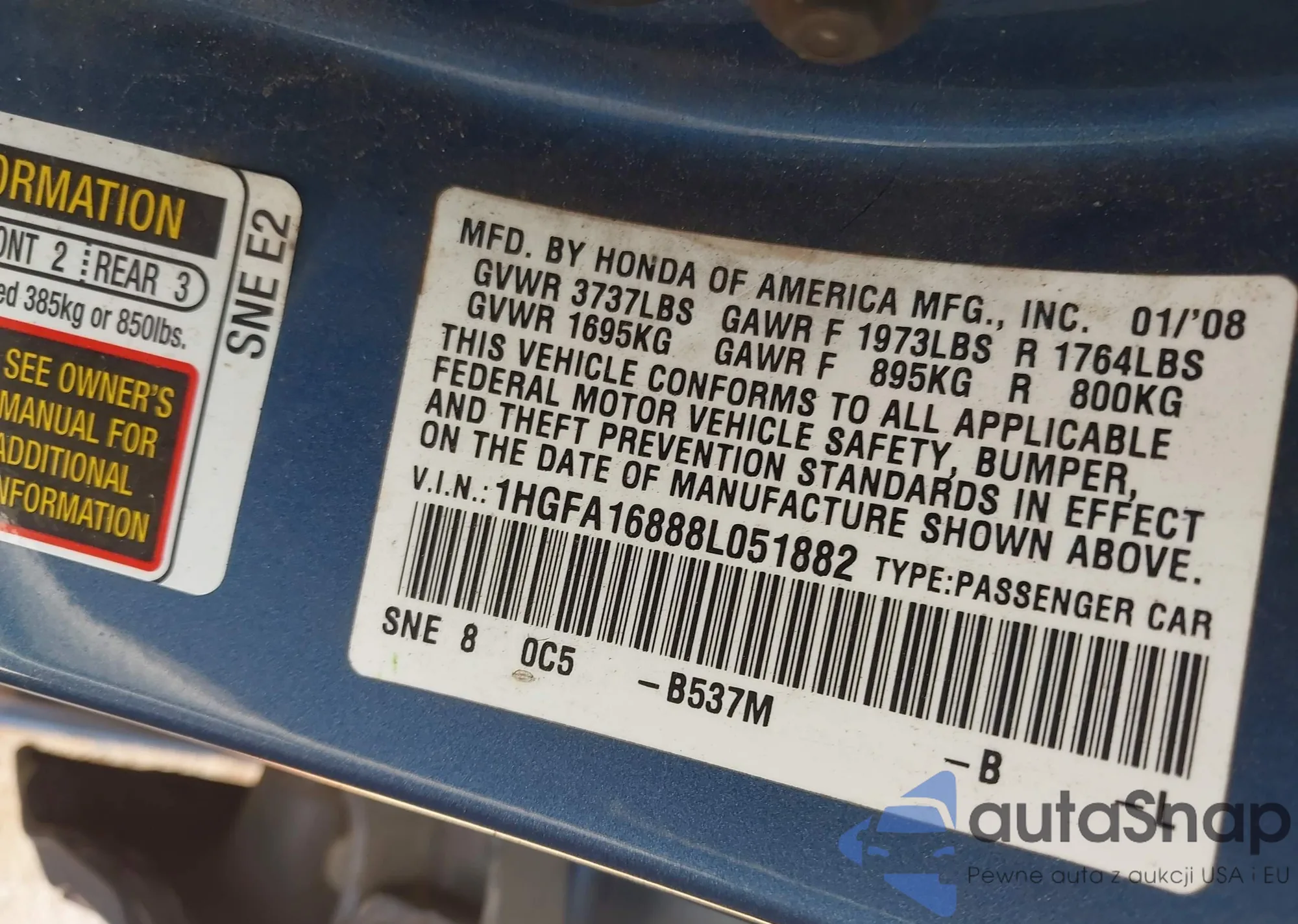LOT: 43010703 VIN: 1HGFA16888L051882