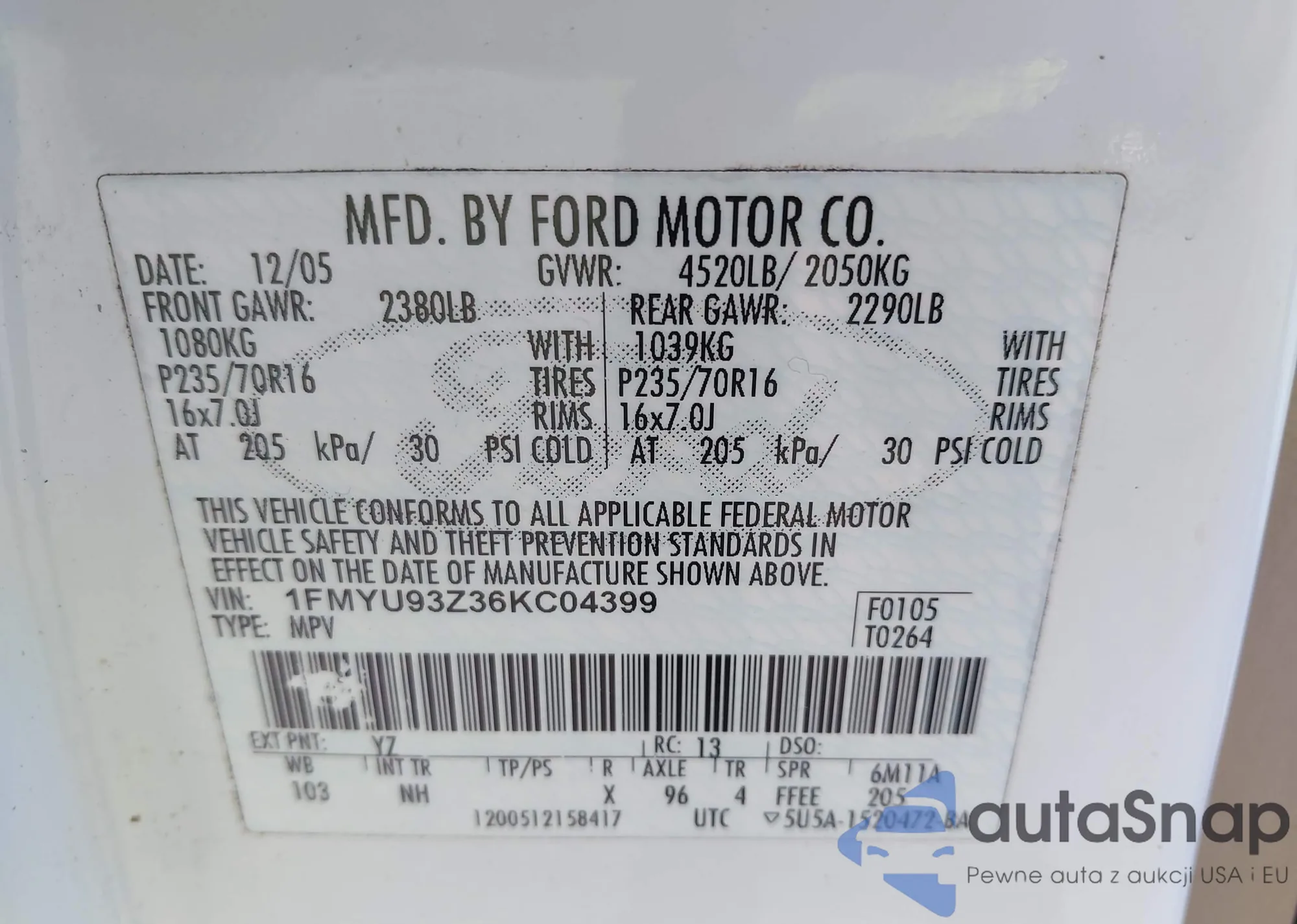 LOT: 43040920 VIN: 1FMYU93Z36KC04399