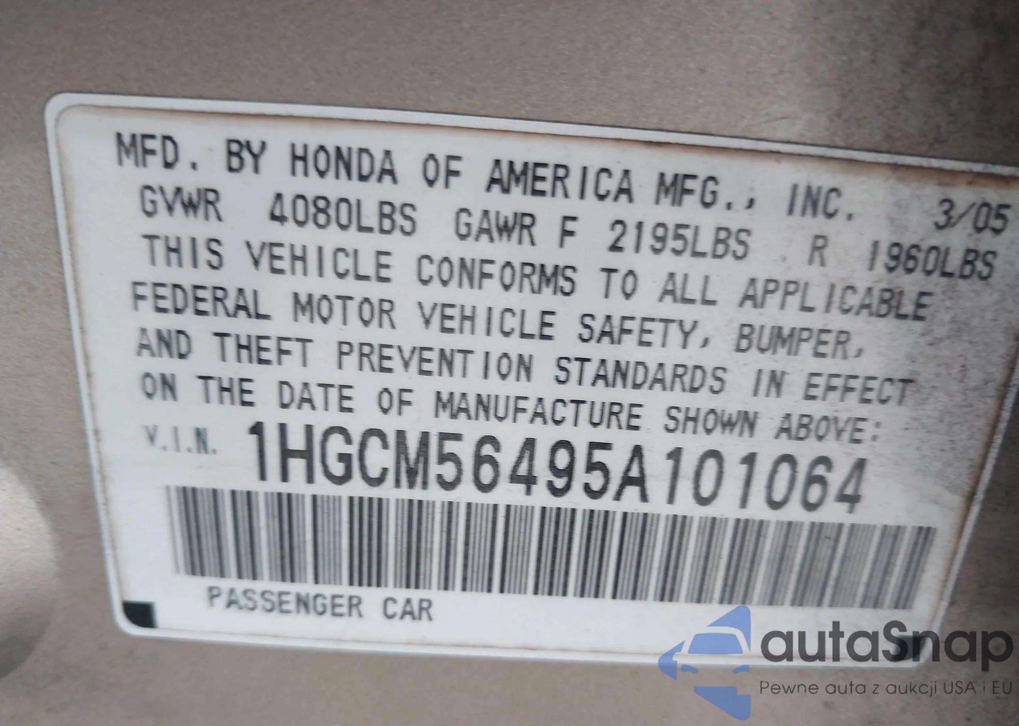 LOT: 43108733 VIN: 1HGCM56495A101064