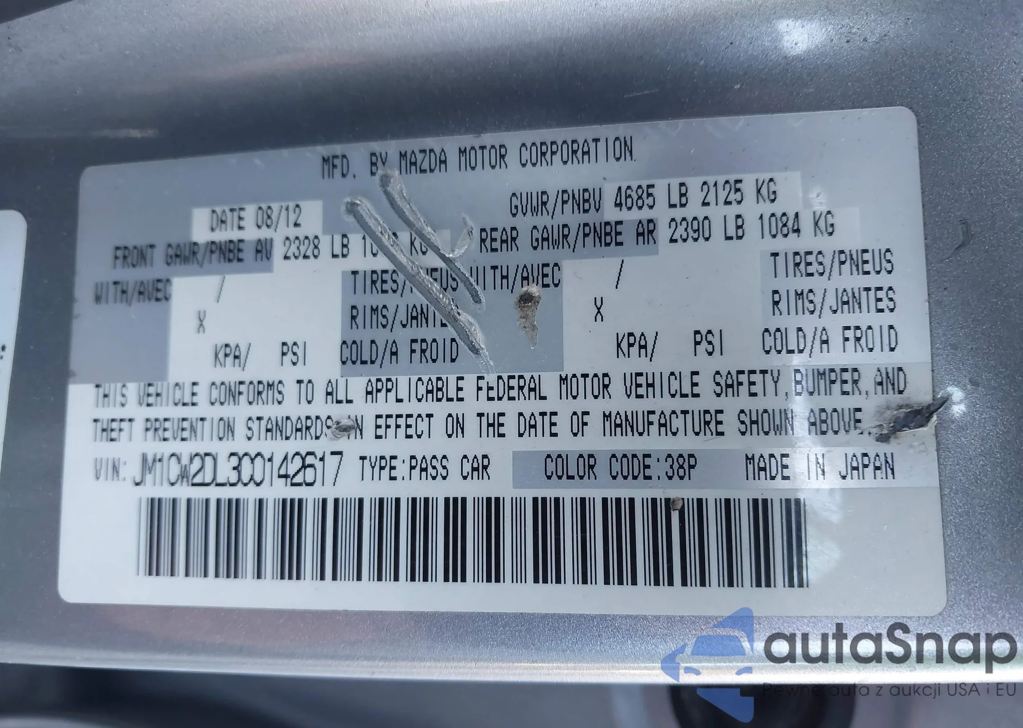 LOT: 43162680 VIN: JM1CW2DL3C0142617