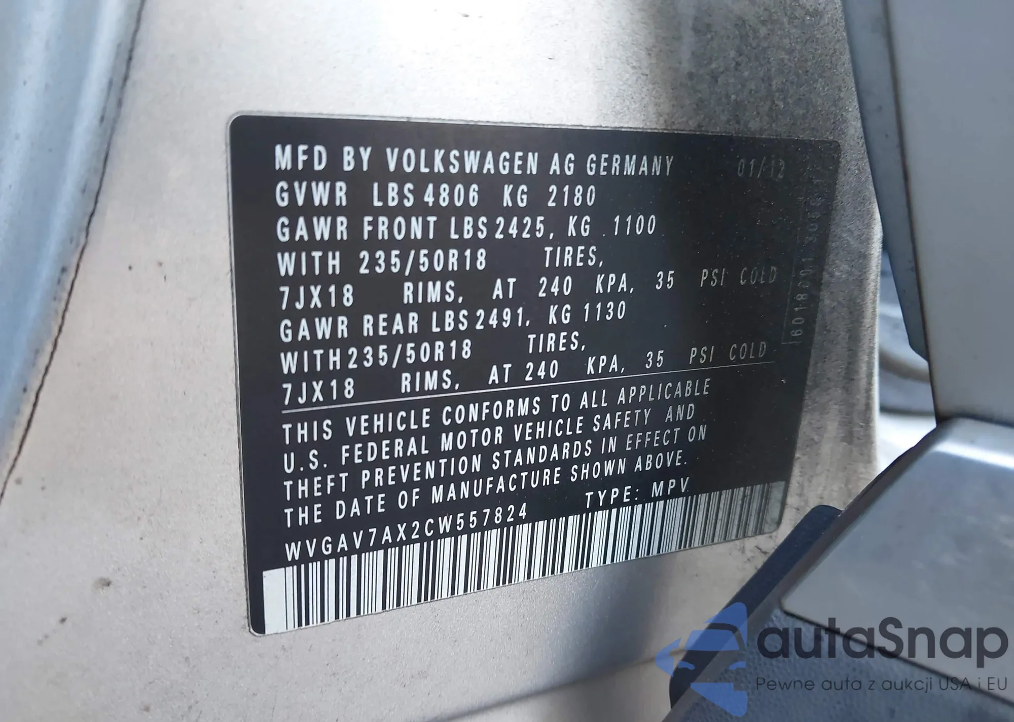 LOT: 43235742 VIN: WVGAV7AX2CW557824