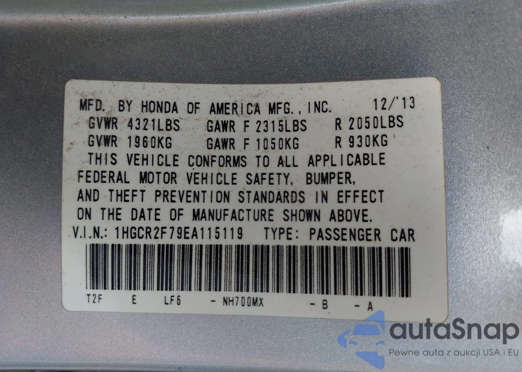 LOT: 42779663 VIN: 19XFC2F72HE201838