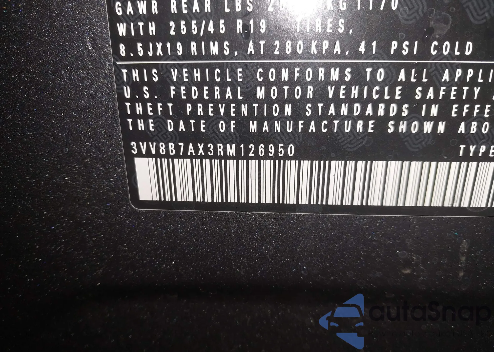 • VIN 3VV8B7AX3RM126950