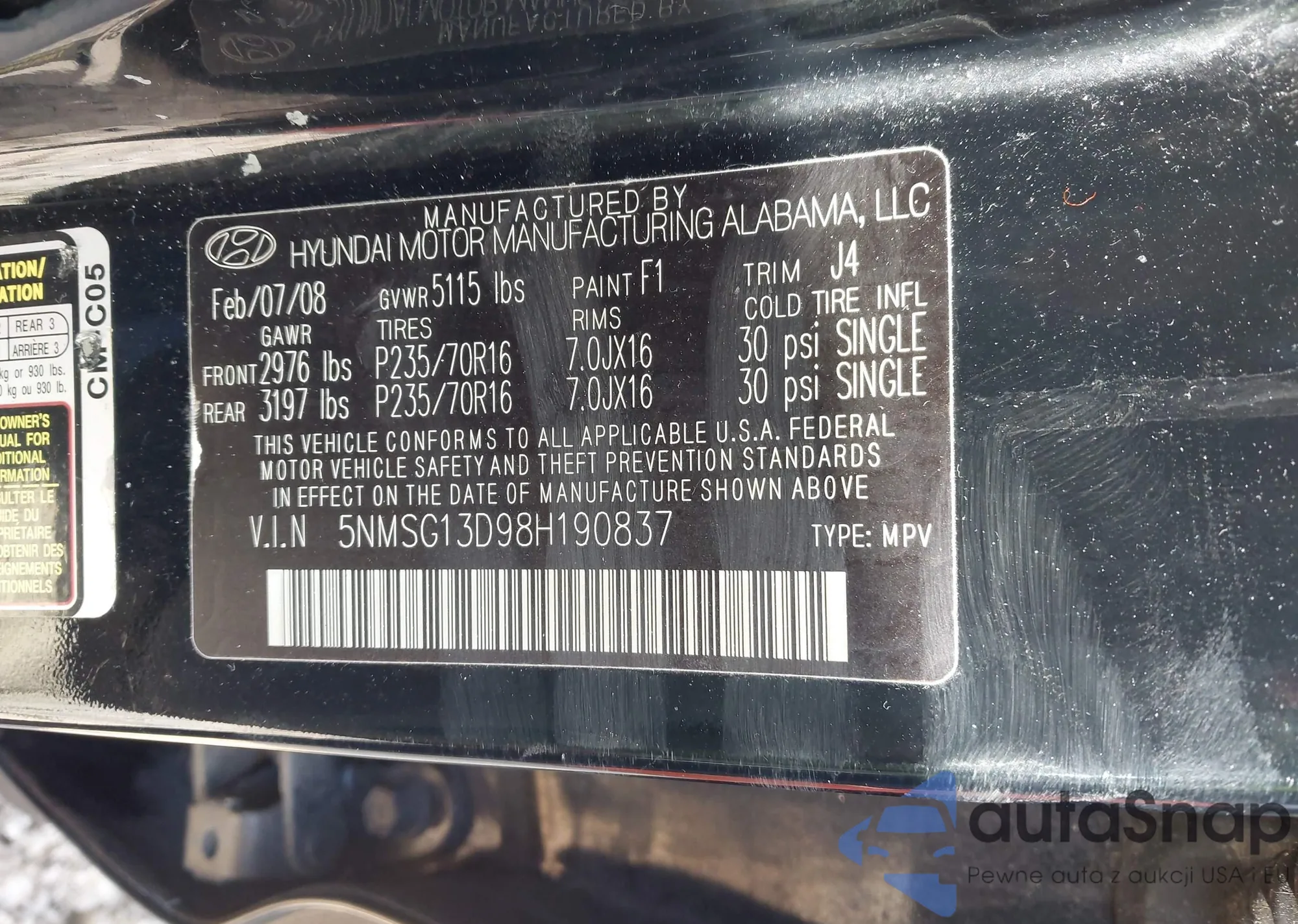 • VIN 5NMSG13D98H190837