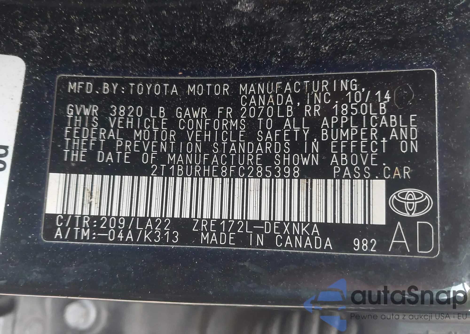• VIN 2T1BURHE8FC285398