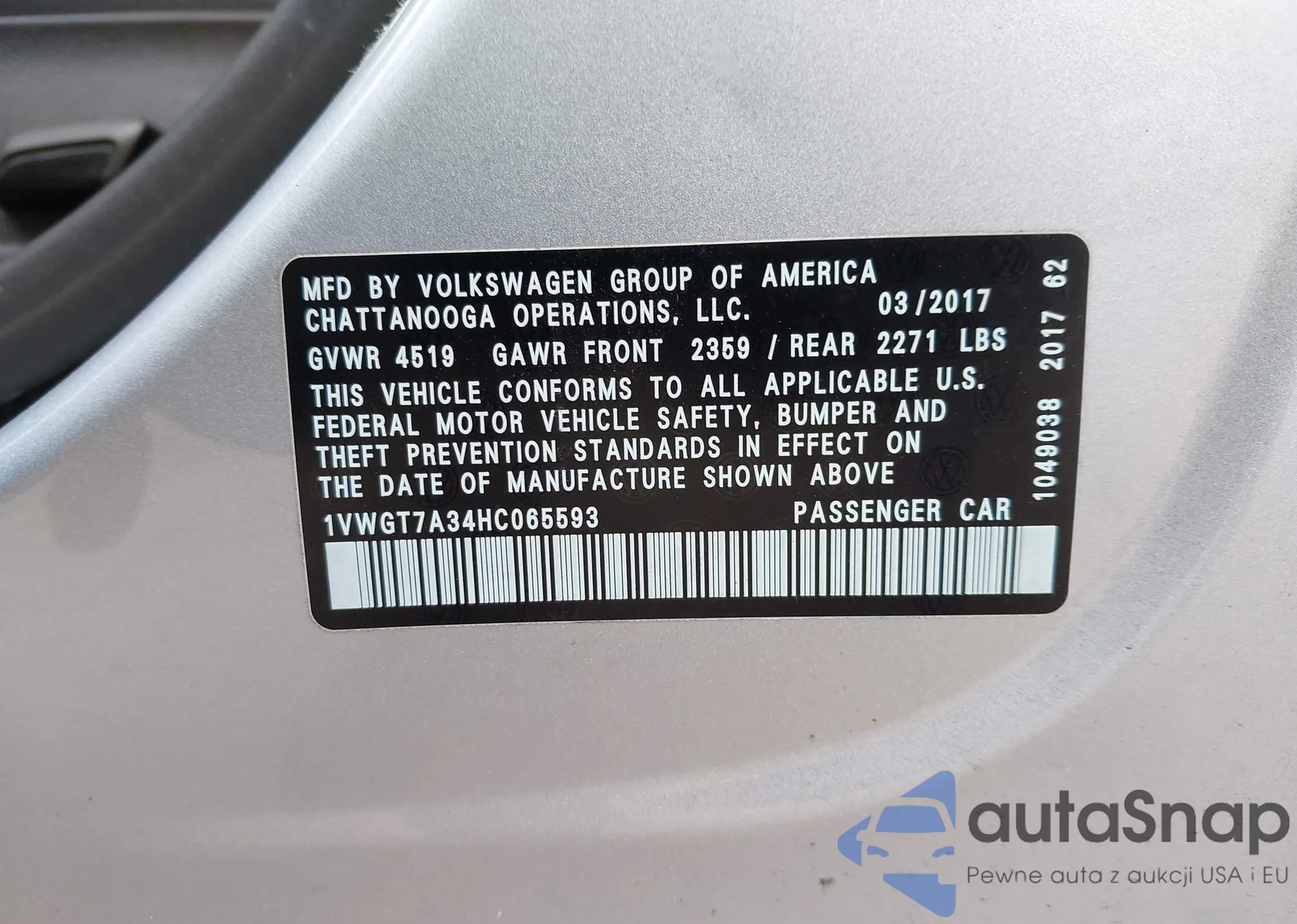 LOT: 42951357 VIN: 1VWGT7A34HC065593