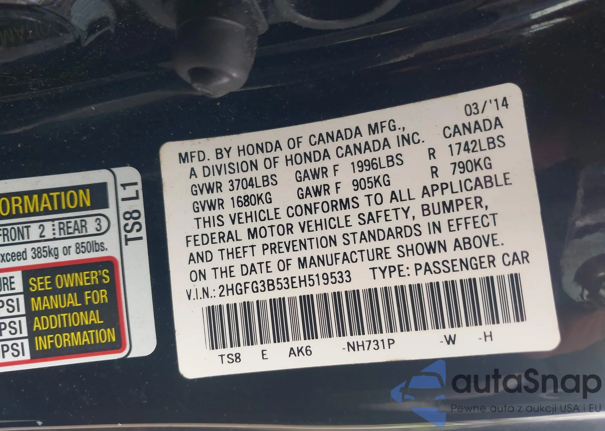 LOT: 43171105 VIN: SHSRD78873U144769