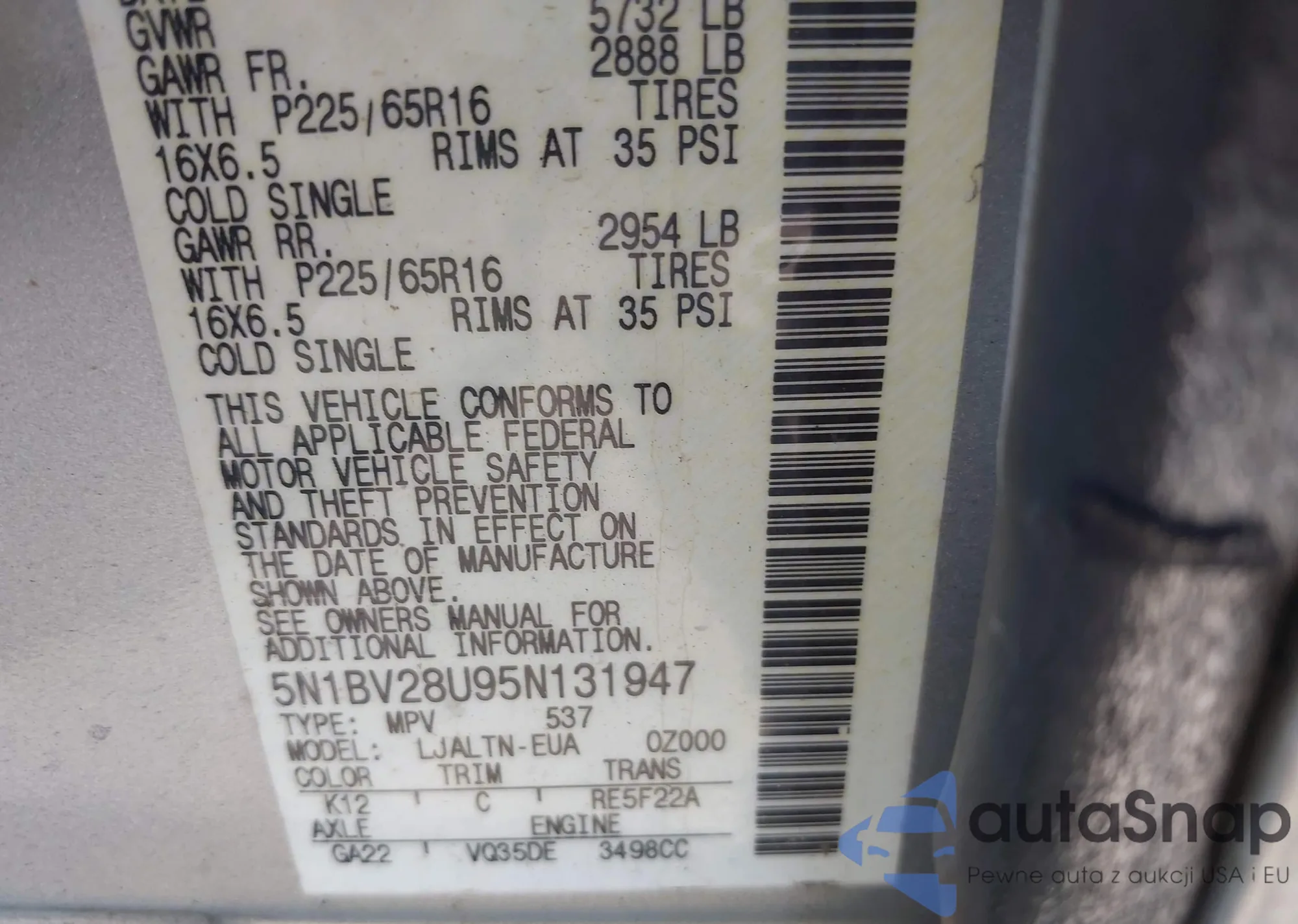 • VIN 5N1BV28U95N131947