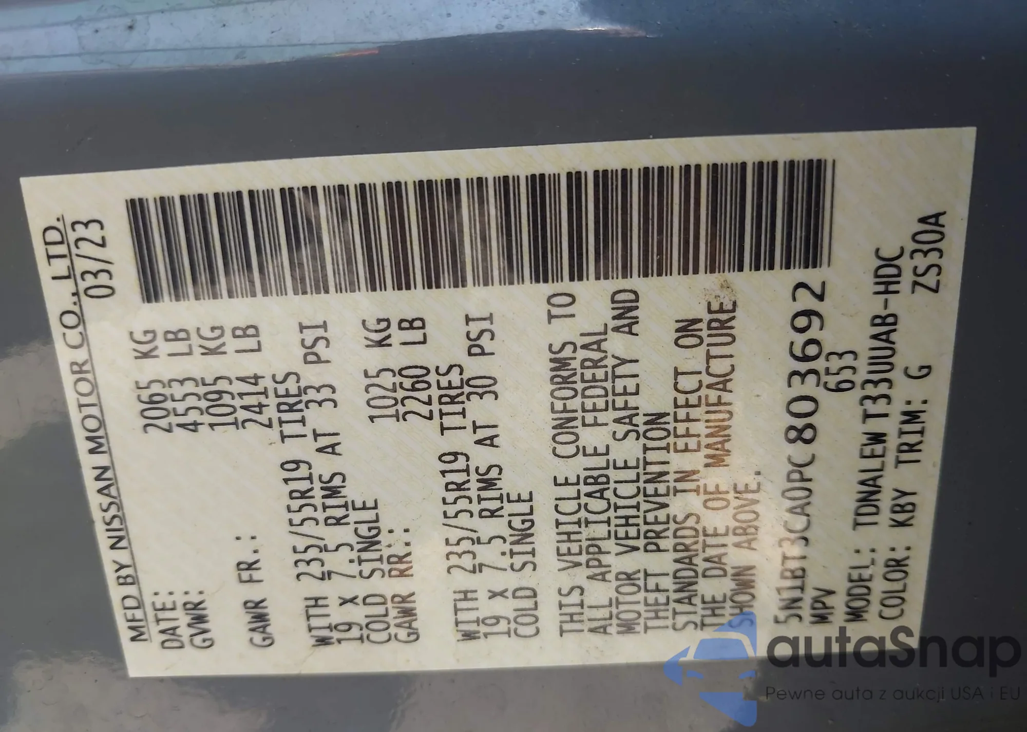 LOT: 42863504 VIN: 5N1BT3CA0PC803692