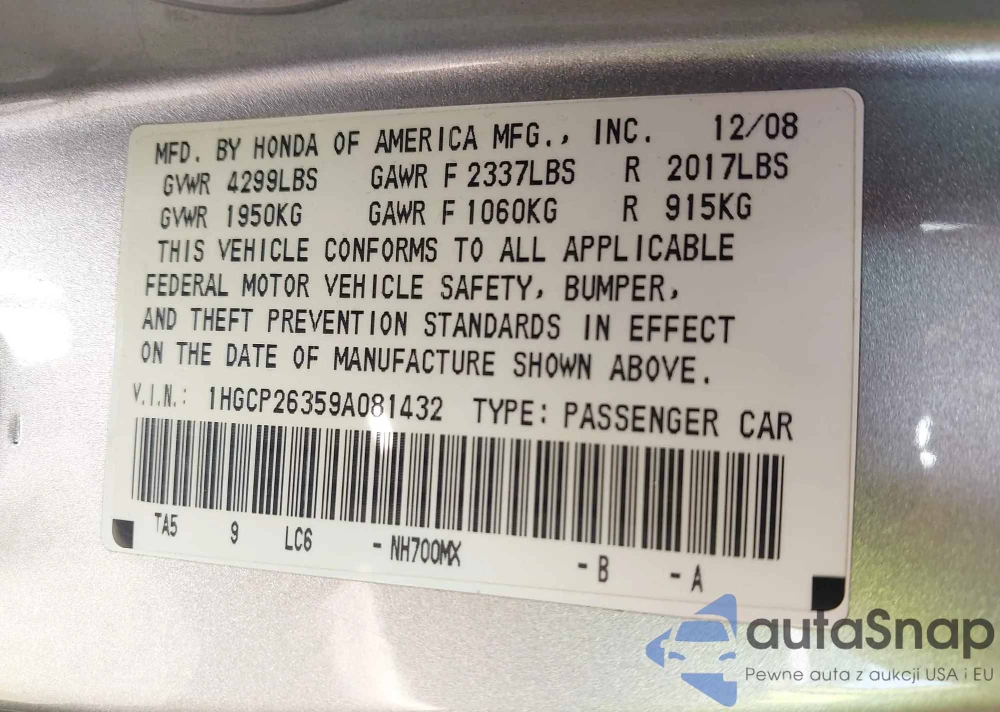 LOT: 43148129 VIN: 1HGCP26359A081432