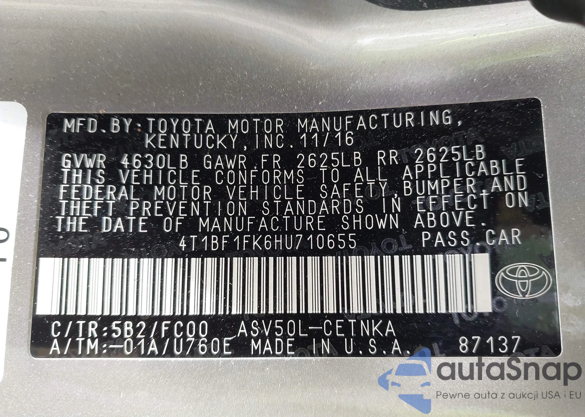 • VIN 4T1BF1FK6HU710655
