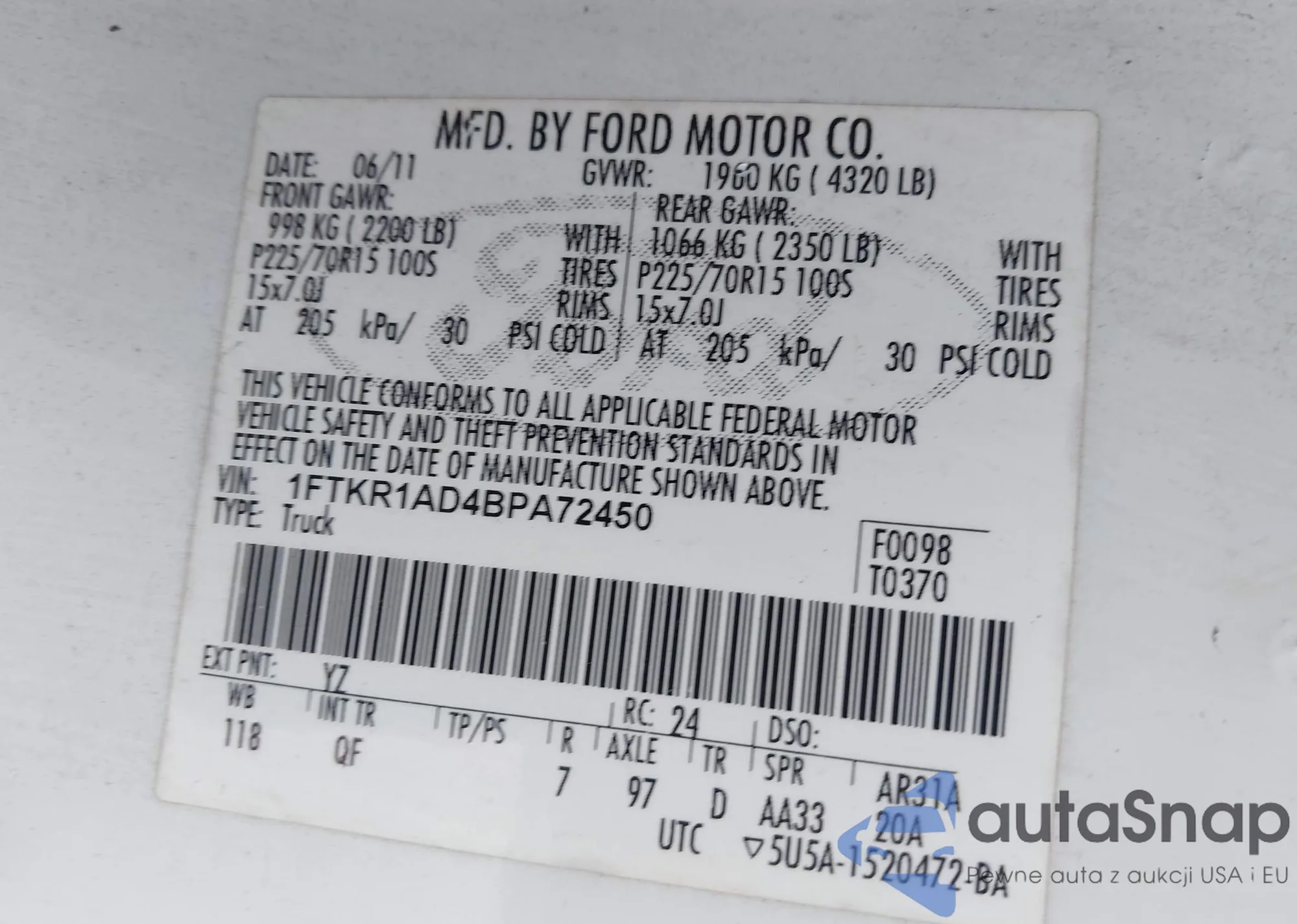 • VIN 1FTKR1AD4BPA72450