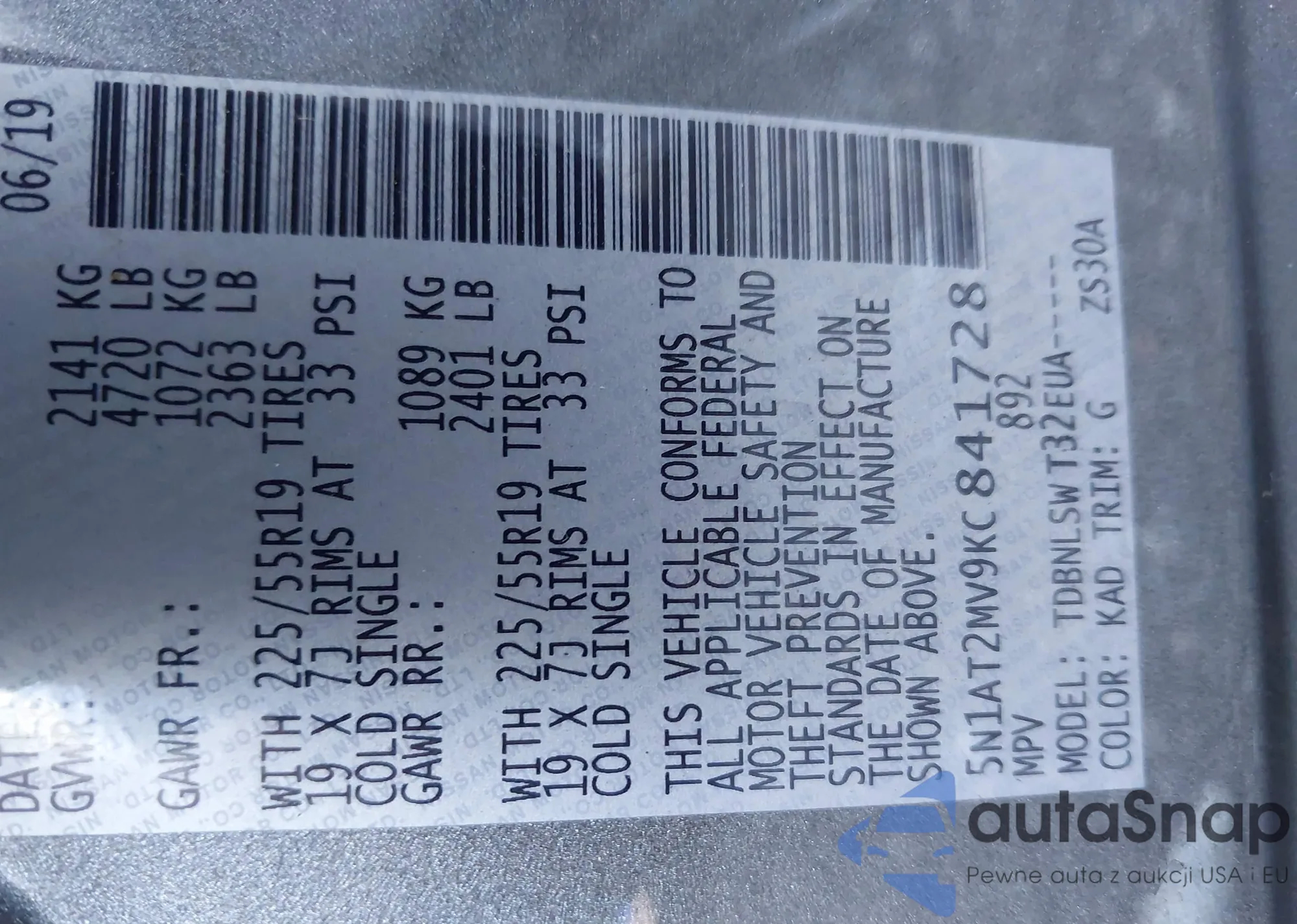 LOT: 43072601 VIN: 5N1AT2MV9KC841728