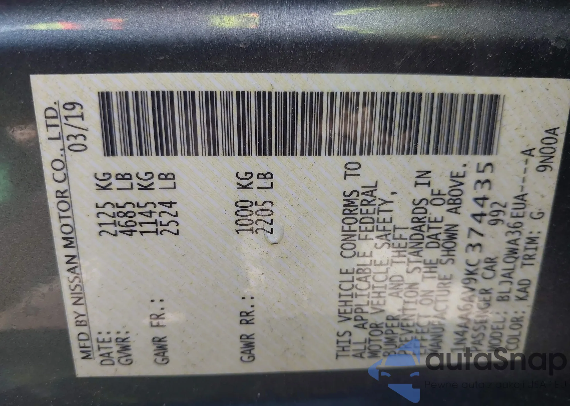 LOT: 43071940 VIN: JN1EV7ARXJM434212