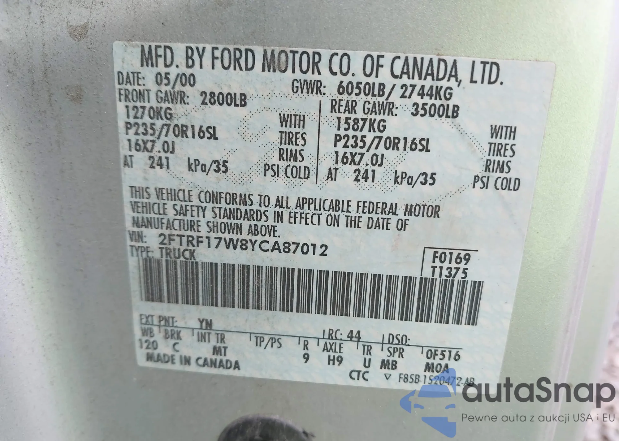 LOT: 43153851 VIN: 2FTRF17W8YCA87012
