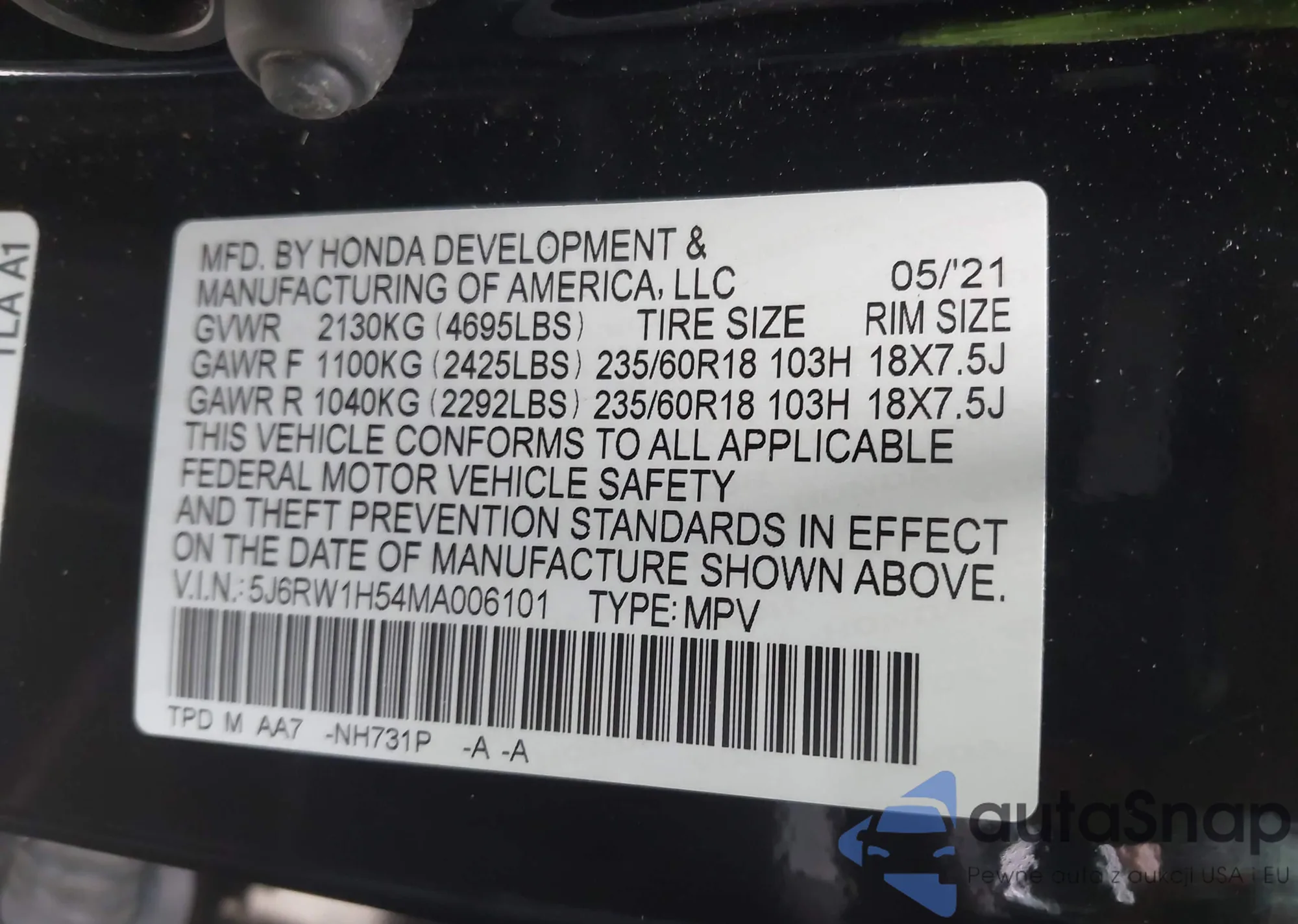 LOT: 42968262 VIN: JHLRE48398C043103