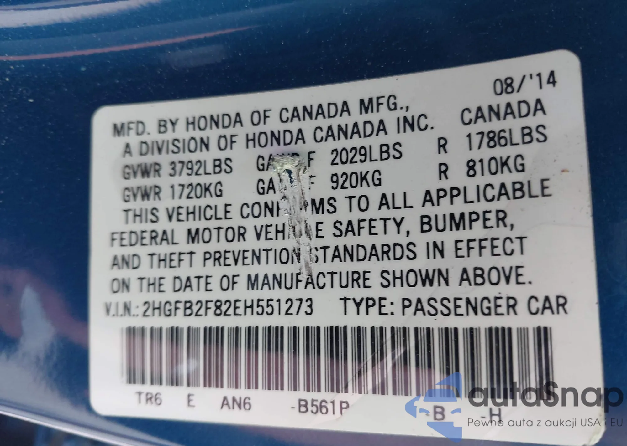 • VIN 2HGFB2F82EH551273