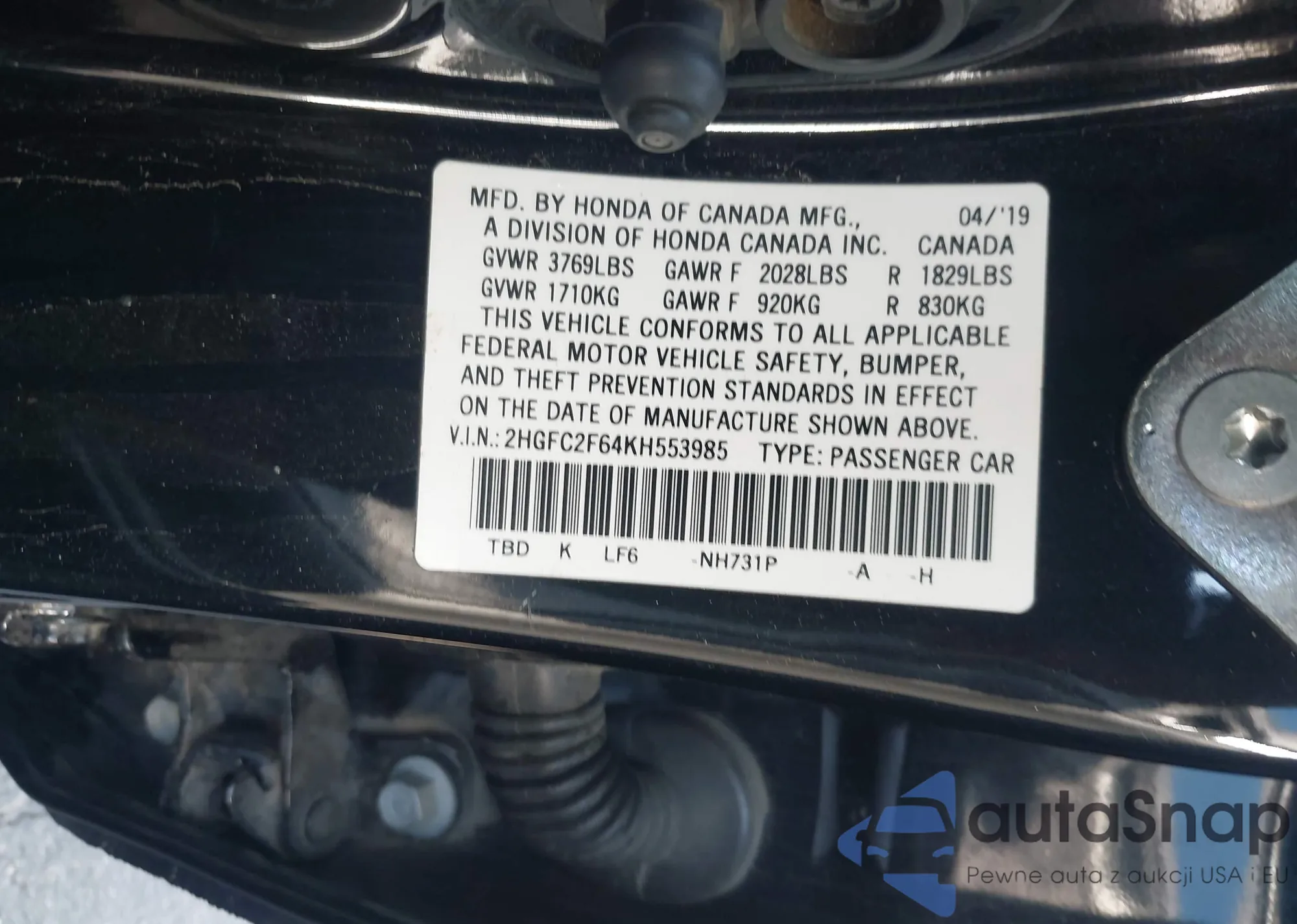 • VIN 2HGFC2F64KH553985