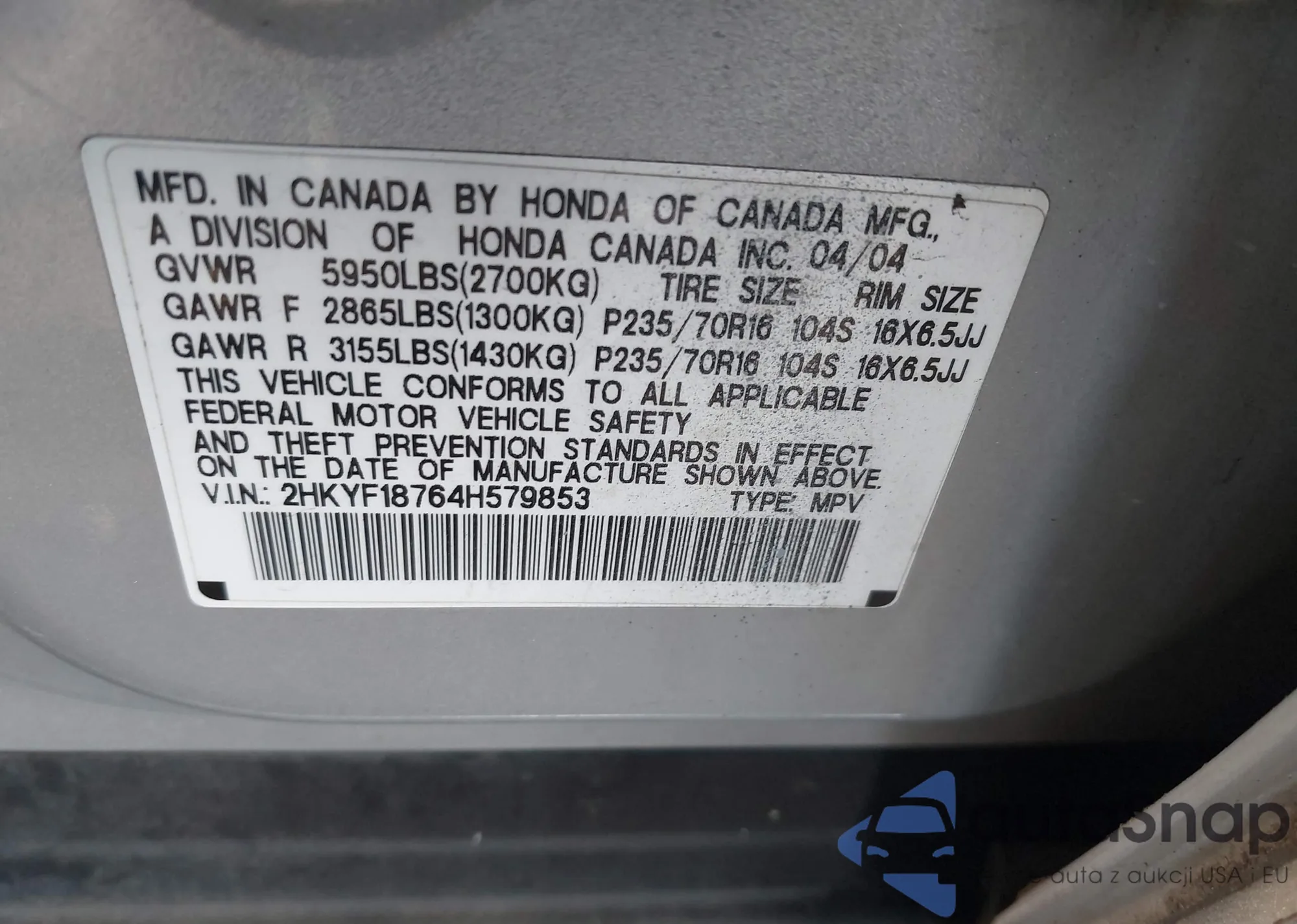 LOT: 43206061 VIN: 2HKYF18764H579853