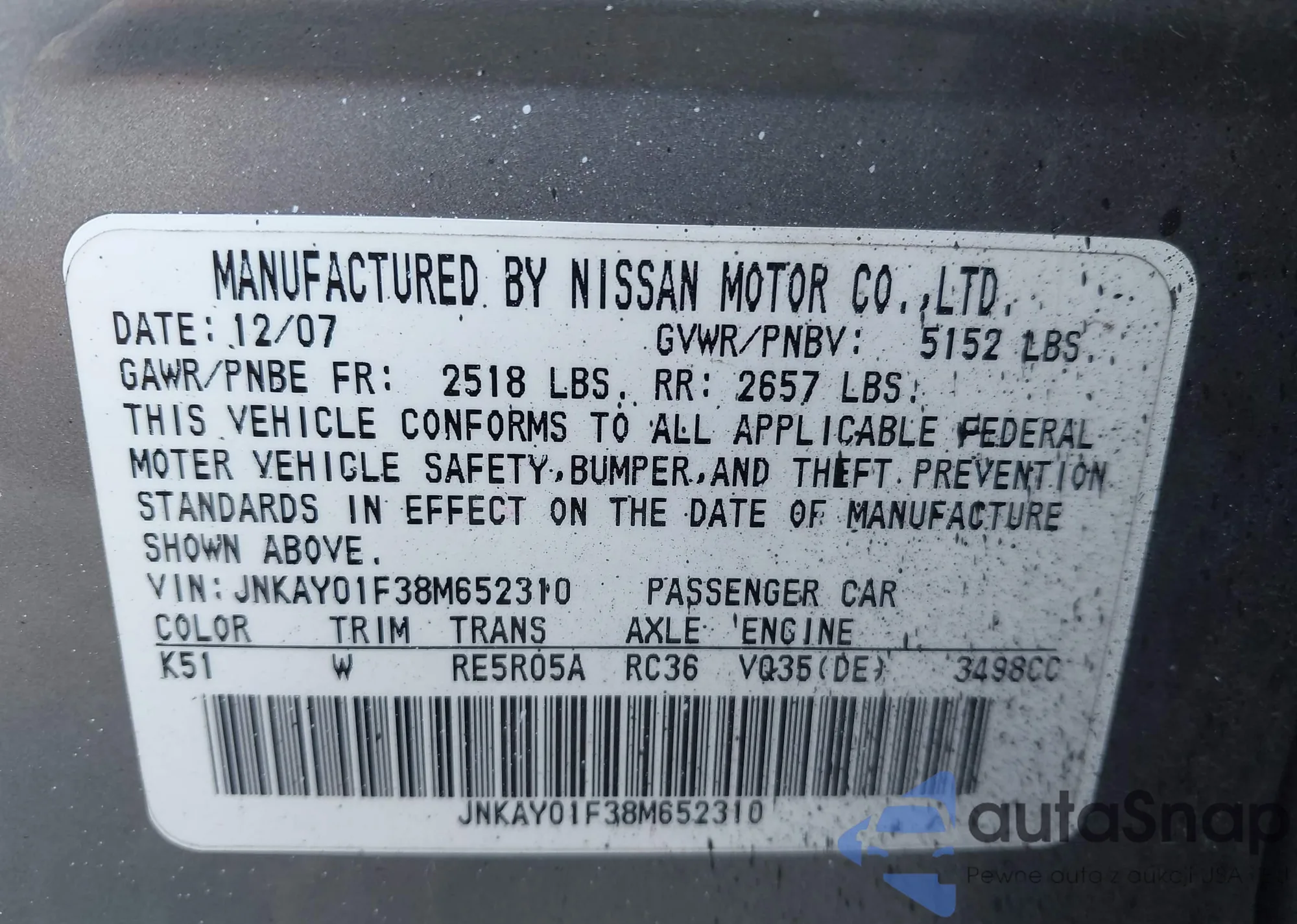 • VIN JNKAY01F38M652310