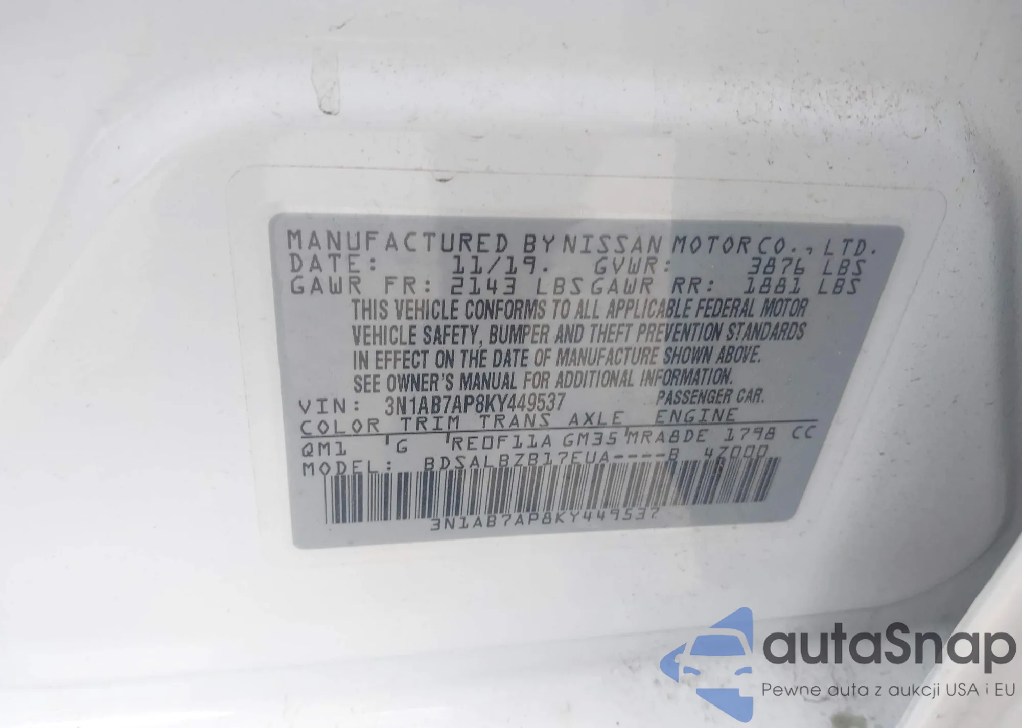 LOT: 43136694 VIN: 3N1AB7AP3HY268595