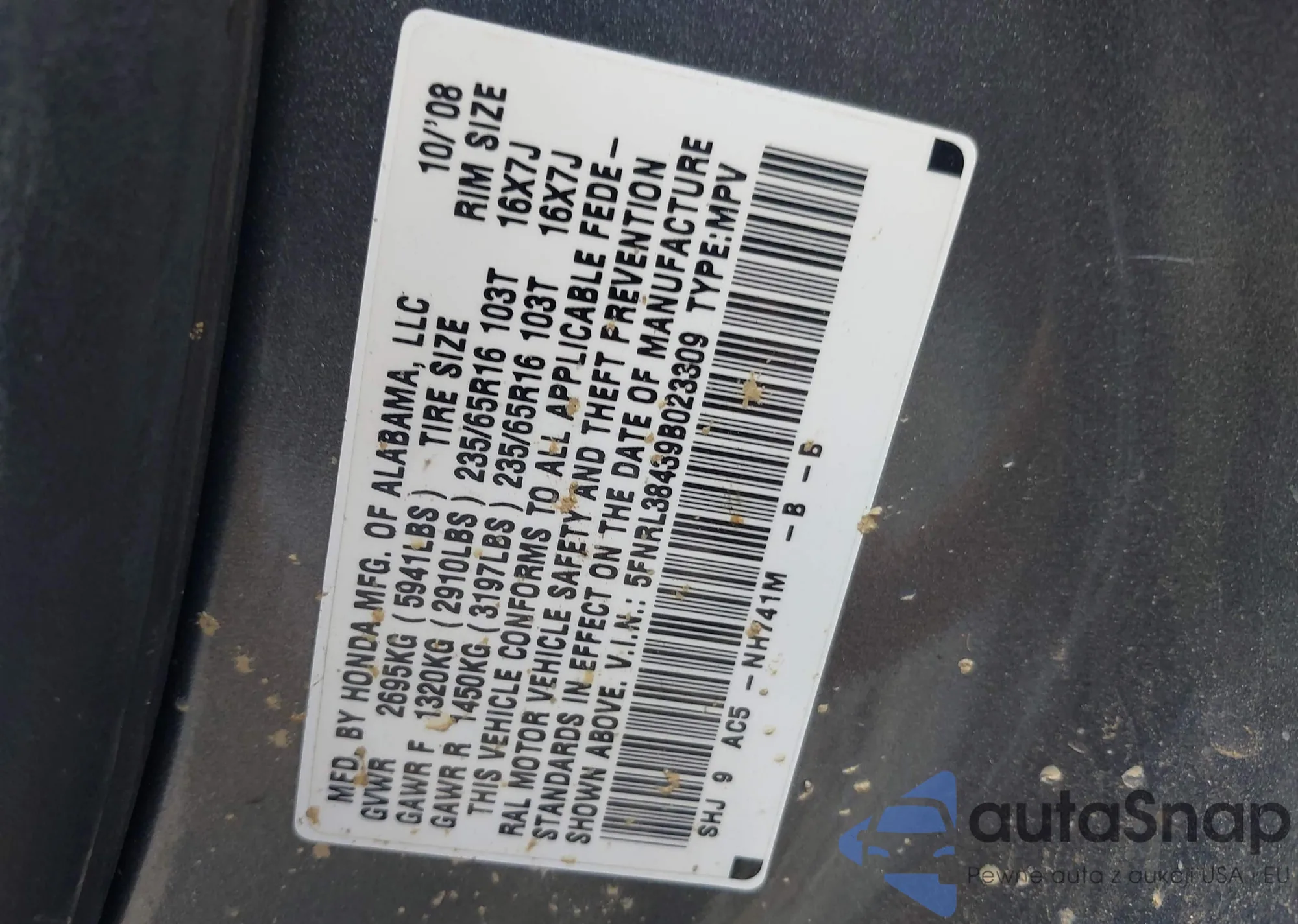 • VIN 5FNRL38439B023309