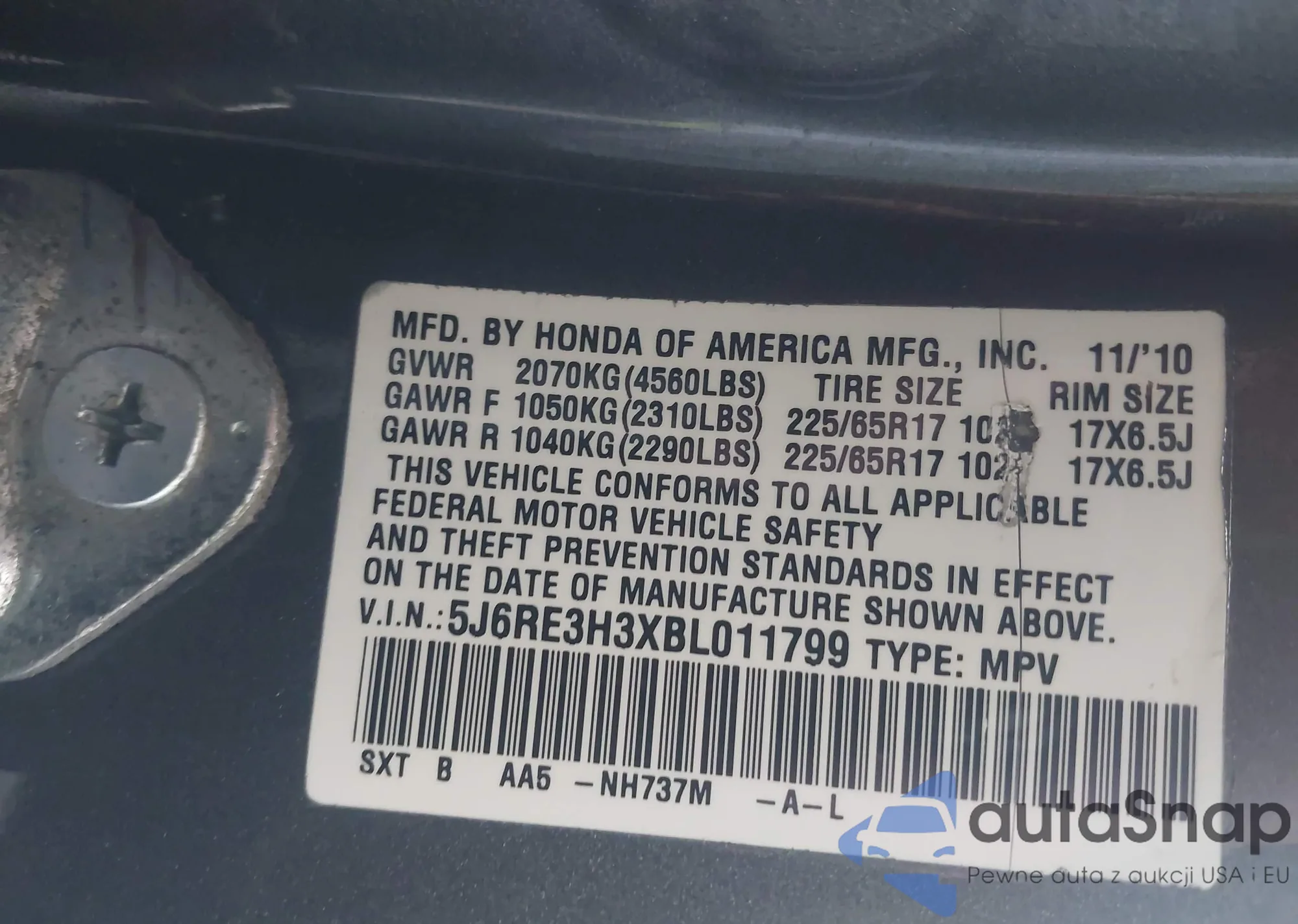 • VIN 5J6RE3H3XBL011799