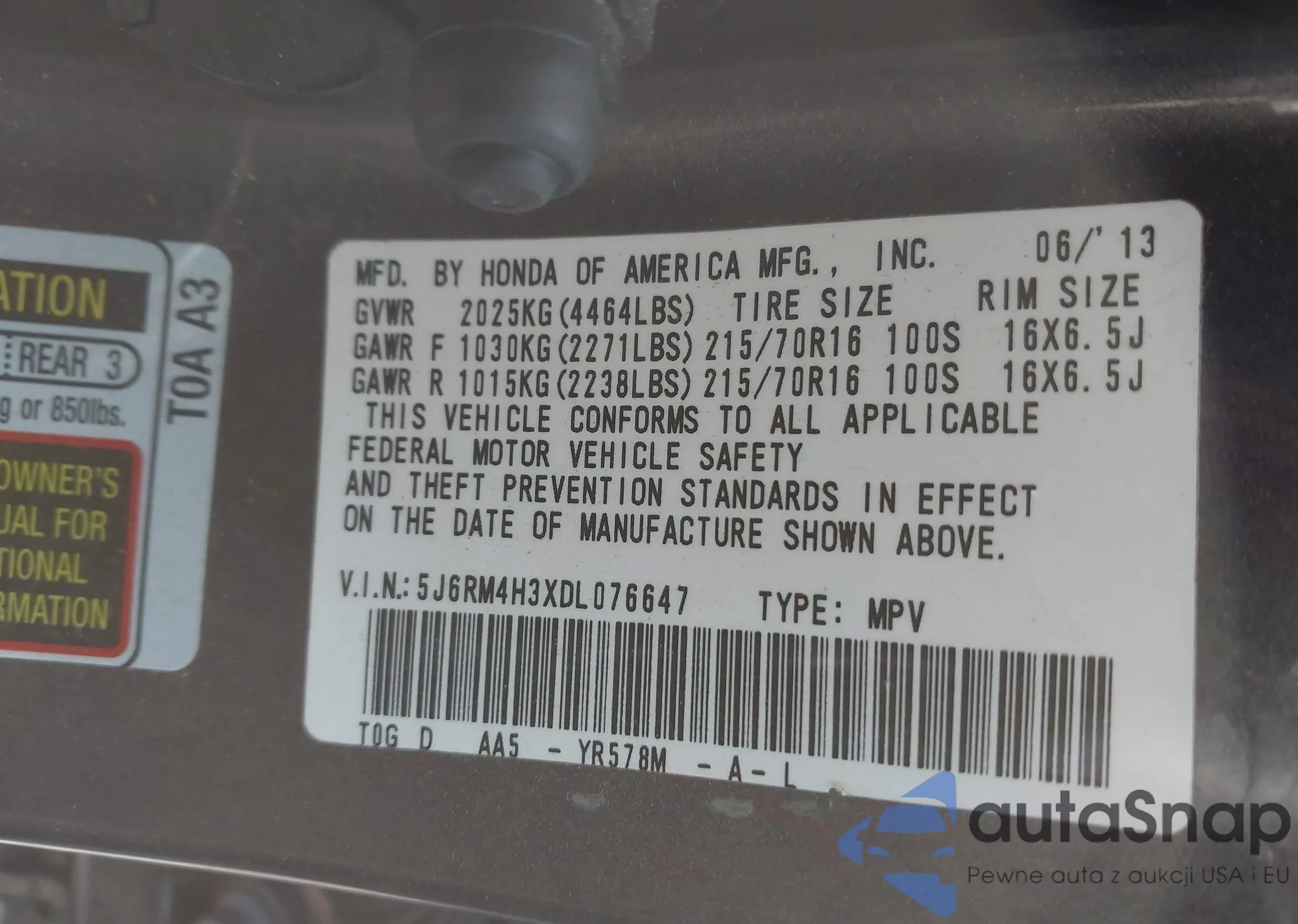 • VIN 5J6RM4H3XDL076647