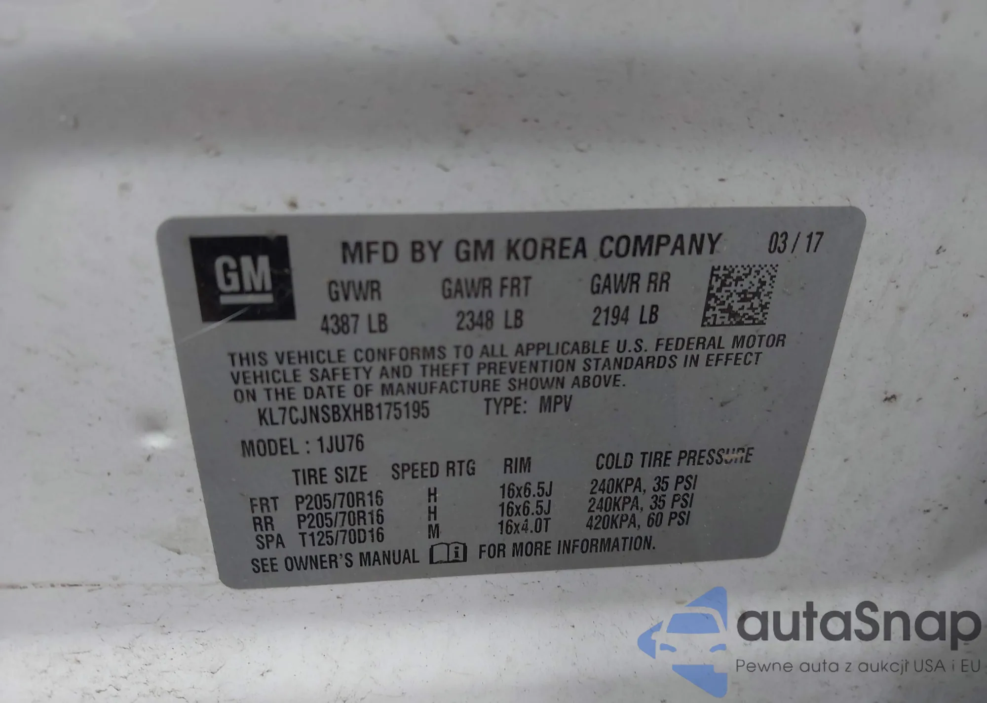 • VIN KL7CJNSBXHB175195