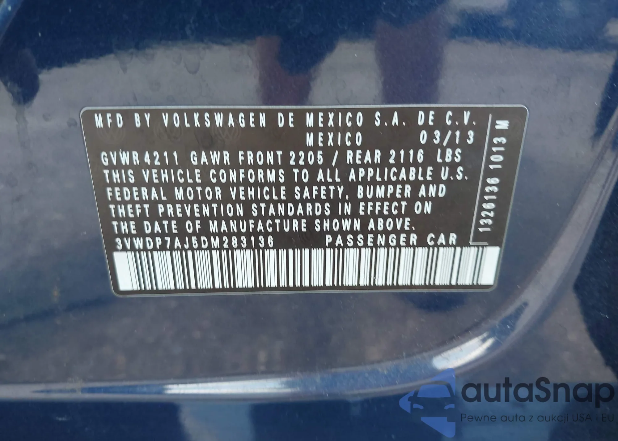 • VIN 1VWBP7A37DC045413