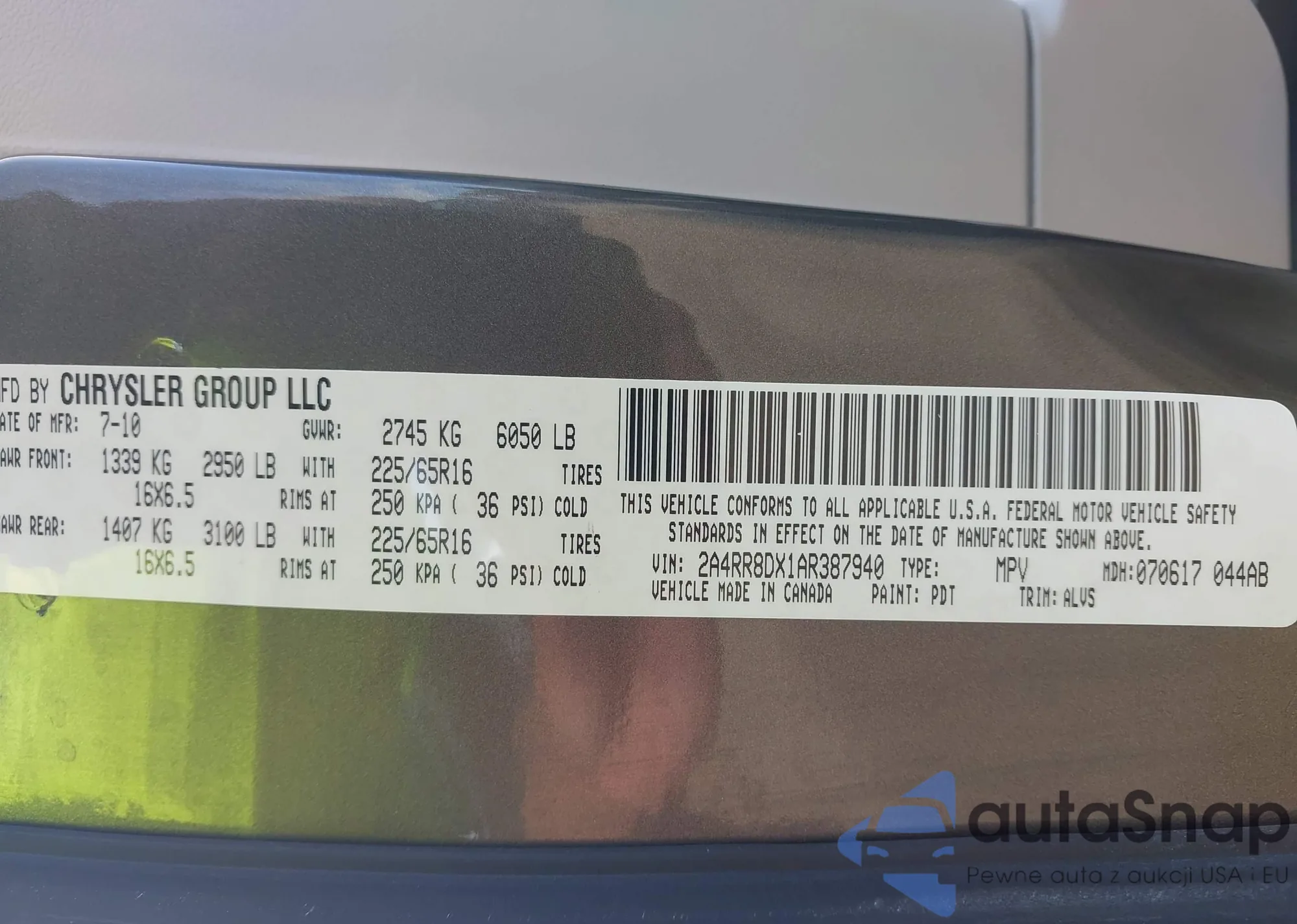 • VIN 2A4RR8DX1AR387940