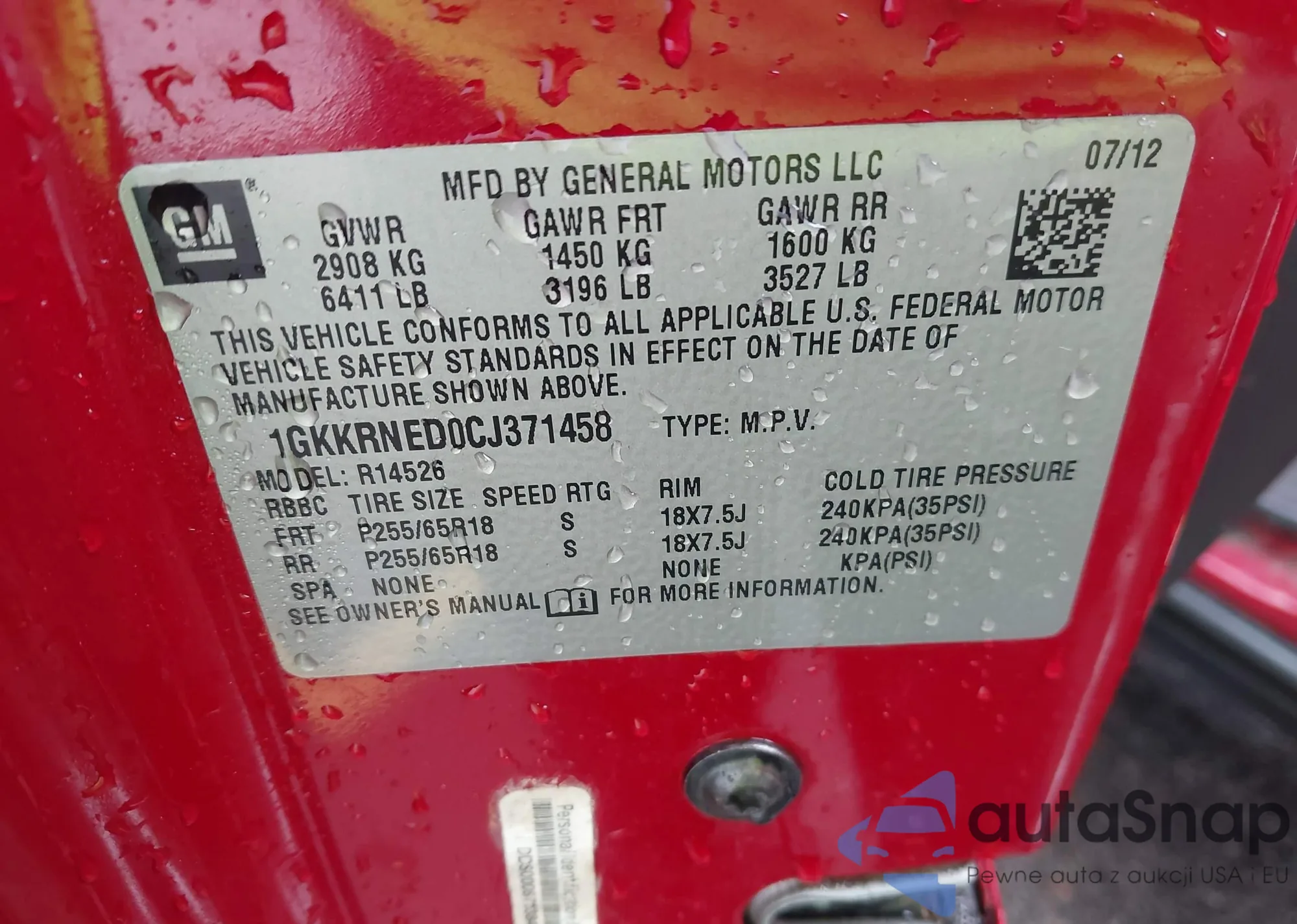 LOT: 42957355 VIN: 1GKKRNED0CJ371458