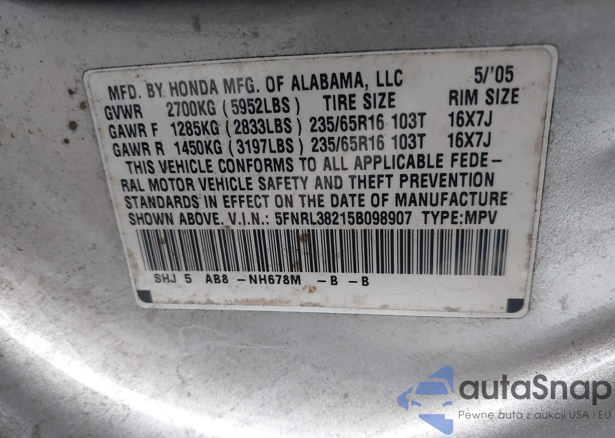 • VIN 5FNRL38215B098907