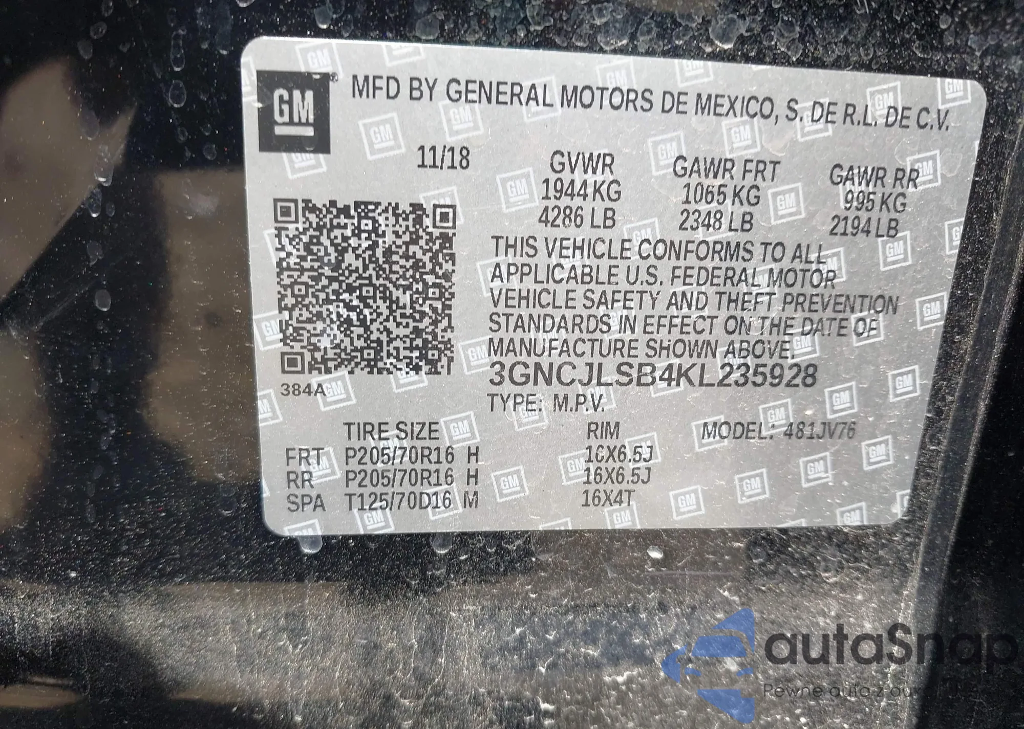 • VIN 3GNCJLSB4KL235928