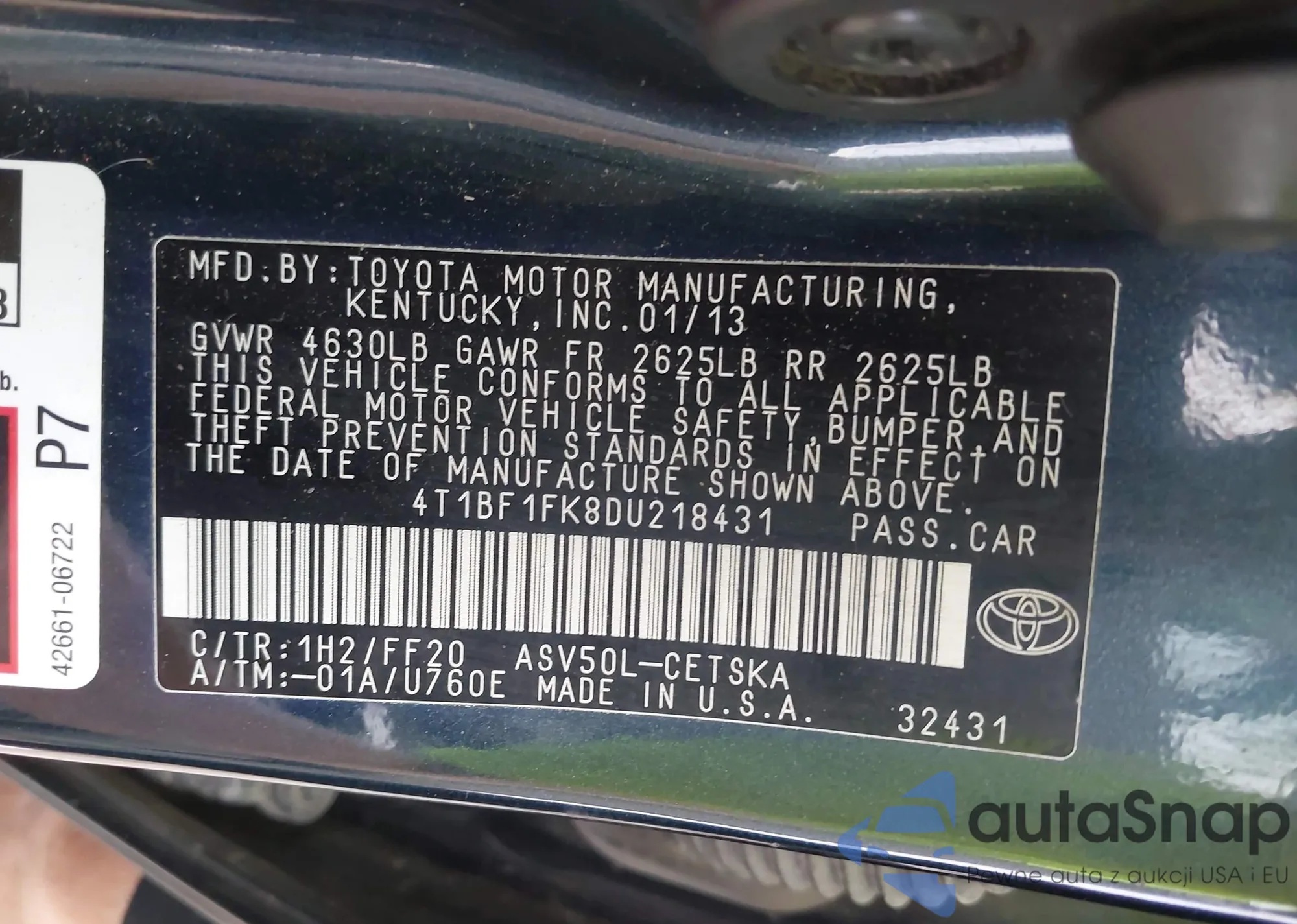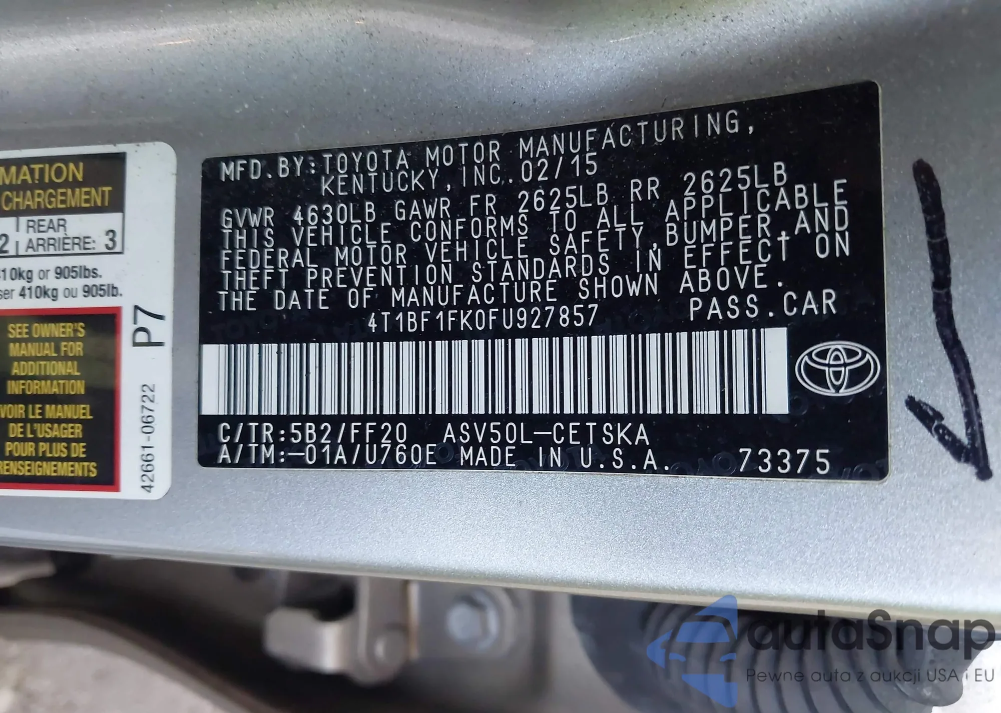 • VIN 4T1BF1FK0FU927857