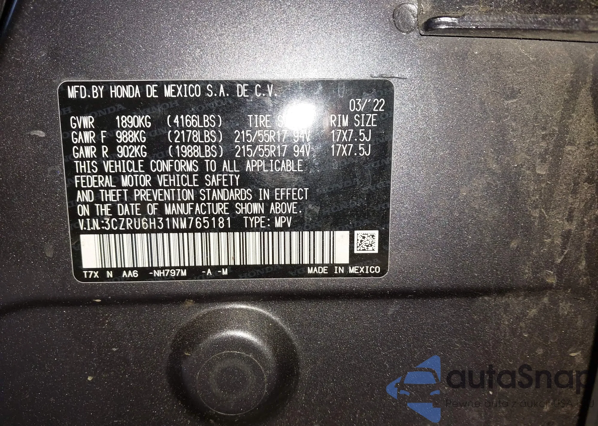 • VIN 5J6RM4H52DL059715