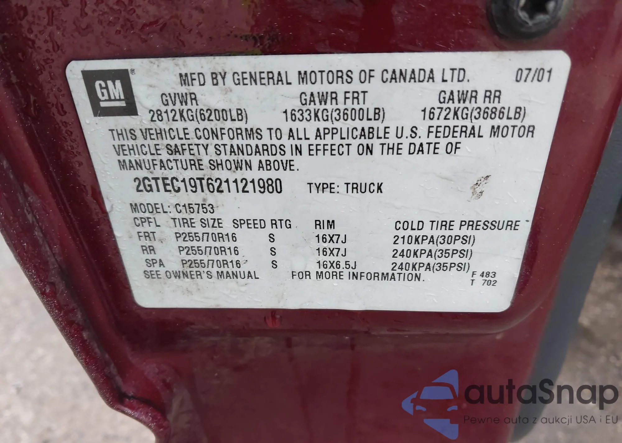• VIN 2GTEC19T621121980