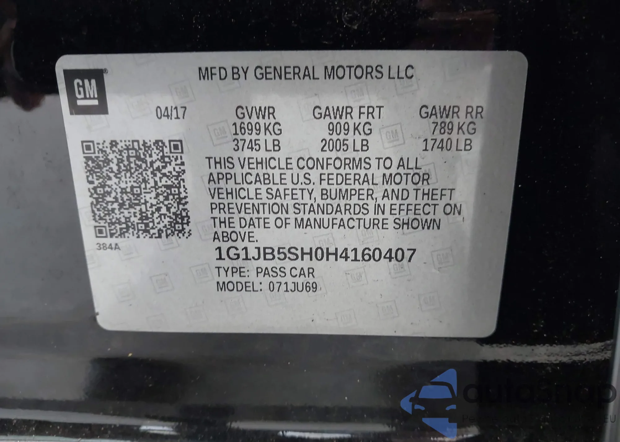 LOT: 43033434 VIN: 1G1JB5SH0H4160407