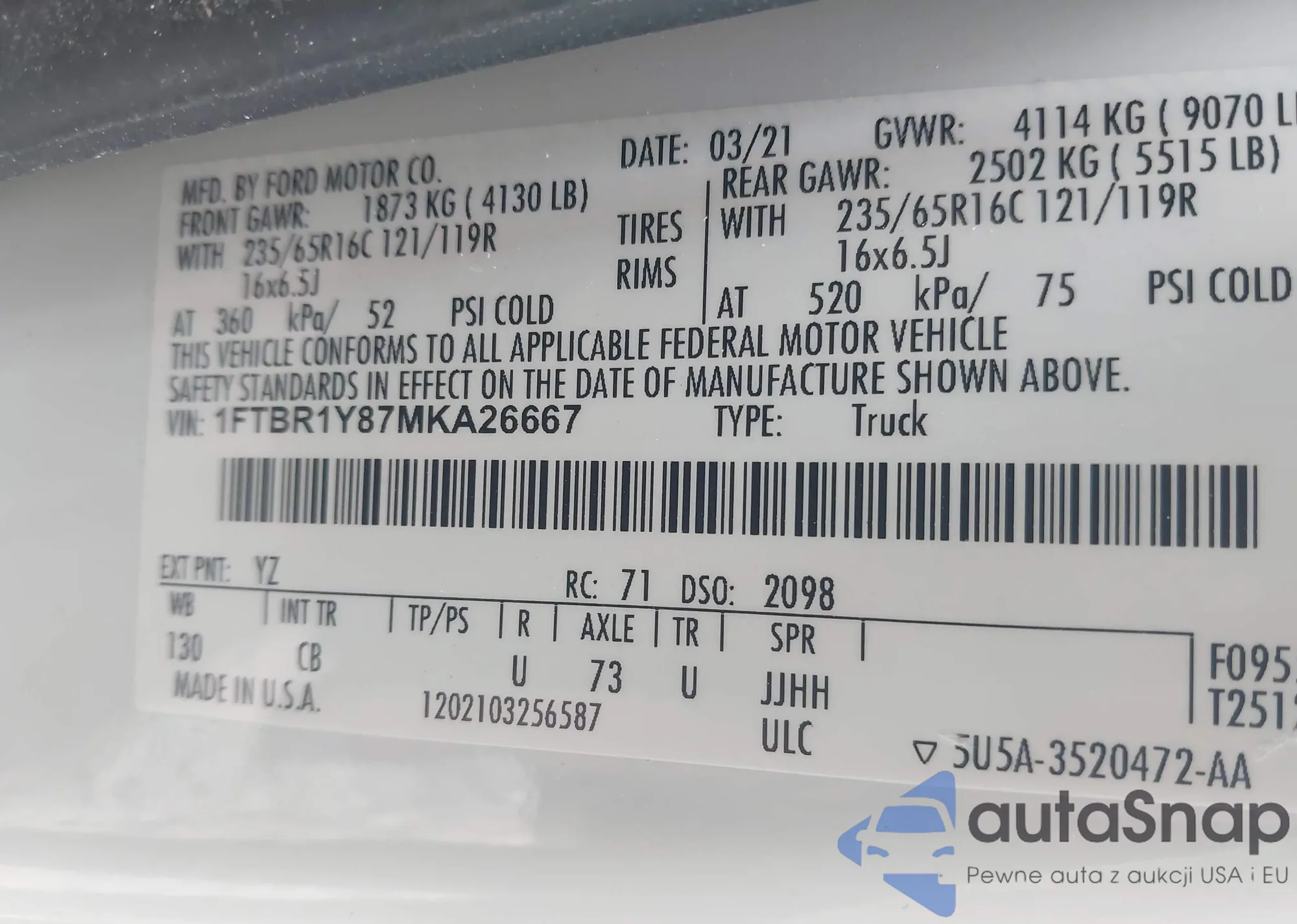 LOT: 41488445 VIN: 1FTBR1Y87MKA26667